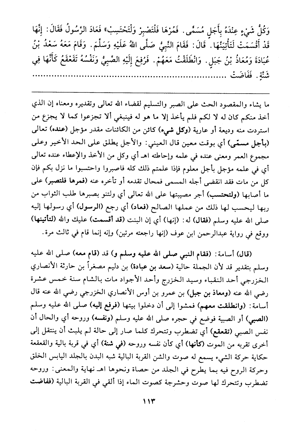 وَكُل شَيءٍ عِنْدَهُ بِأَجَلٍ مُسَمَّى. فَمُرْهَا فَلْتَصْبِرْ وَلْتَحْتَسِبْ" فَعَادَ الرَّسُولُ فَقَال: إِنَّهَا قَدْ أَقْسَمَتْ لَتَأْتِيَنَّهَا. قَال: فَقَامَ النَّبِيُّ - صلى اللهُ عَلَيهِ وَسلَّمَ-. وَقَامَ مَعَهُ سَعْدُ بْنُ عُبَادَةَ وَمُعَاذُ بْنُ جَبَلٍ. وَانْطَلَقْتُ مَعَهُمْ. فَرُفِعَ إِلَيهِ الصَّبِيُّ وَنَفْسُهُ تَقَعْقَعُ كَأَنَّهَا في شَنَّةٍ. فَفَاضَتْ