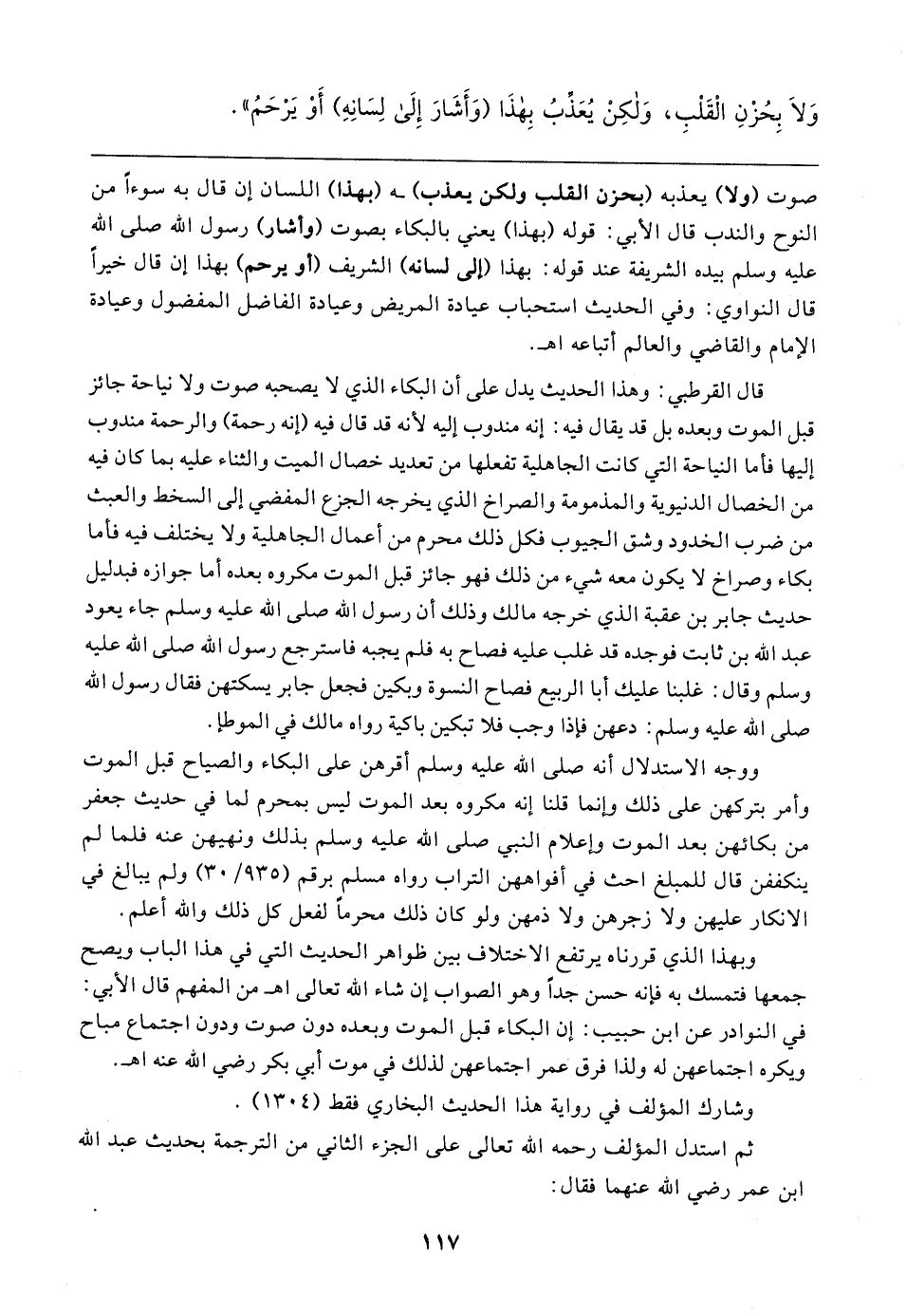 وبهذا الذي قررناه يرتفع الاختلاف بين ظواهر الحديث التي في هذا الباب ويصح جمعها فتمسك به فإنه حسن جدًّا وهو الصواب إن شاء الله تعالى اهـ من المفهم قال الأبي: في النوادر عن ابن حبيب: إن البكاء قبل الموت وبعده دون صوت ودون اجتماع مباح ويكره اجتماعهن له ولذا فرق عمر اجتماعهن لذلك في موت أبي بكر رضي الله عنه اهـ.