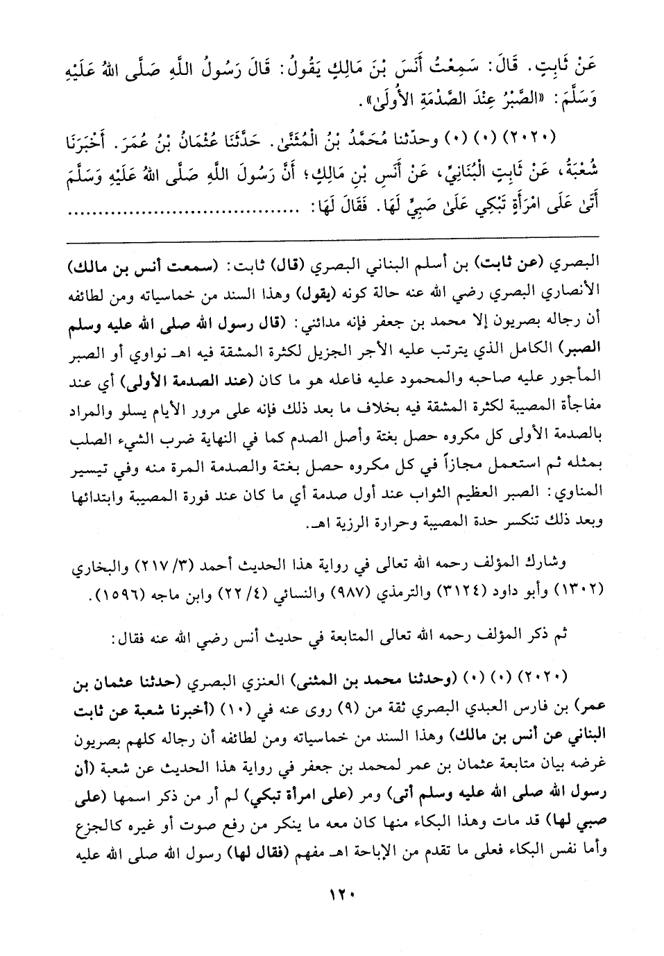 (٢٠٢٠) (٠) (٠) وحدَّثنا مُحَمَّدُ بْنُ الْمُثَنَّى. حَدَّثَنَا عُثْمَانُ بْنُ عُمَرَ. أَخْبَرَنَا شُعْبَةُ، عَنْ ثَابِتٍ الْبُنَانِيِّ، عَنْ أَنسِ بْنِ مَالِكٍ؛ أَنَّ رَسُولَ الله صَلَّى اللهُ عَلَيهِ وَسَلَّمَ أَتَى عَلَى امْرَأَةٍ تَبْكِي عَلَى صَبِيٍّ لَهَا. فَقَال لَهَا: