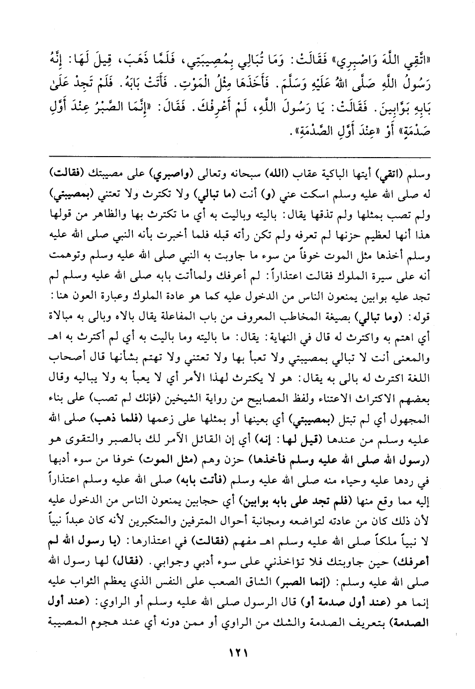 "اتَّقِي اللهَ وَاصْبِرِي" فَقَالتْ: وَمَا تُبَالِي بِمُصِيبَتِي، فَلَمَّا ذَهَبَ، قِيلَ لَهَا: إِنَّهُ رَسُولُ الله صَلَّى اللهُ عَلَيهِ وَسَلَّمَ. فَأَخَذَهَا مِثْلُ الْمَوْتِ. فَأَتَتْ بَابَهُ. فَلَمْ تَجِدْ عَلَى بَابِهِ بَوَّابِينَ. فَقَالتْ: يَا رَسُولَ الله، لَمْ أَعْرِفْكَ. فَقَال: "إِنَّمَا الصَّبْرُ عِنْدَ أَوَّلِ صَدْمَةٍ" أَوْ "عِنْدَ أَوَّلِ الصَّدْمَةِ"