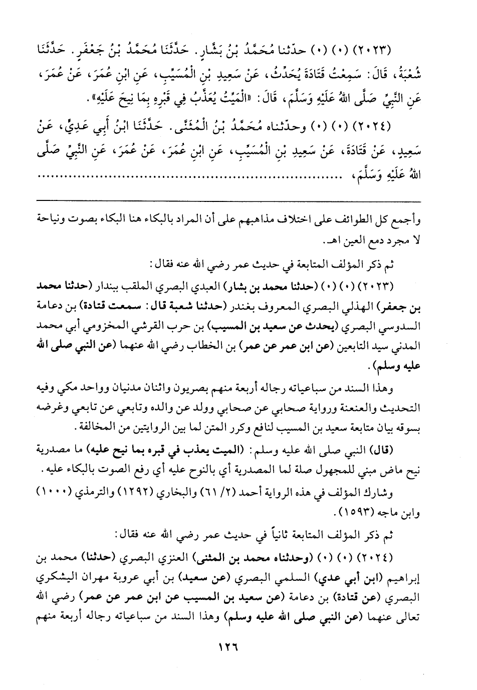 (٢٠٢٣) (٠) (٠) حدَّثنا مُحَمَّدُ بْنُ بَشارٍ. حَدَّثَنَا مُحَمَّدُ بْنُ جَعْفَرٍ. حَدَّثَنَا شُعْبَةُ، قَال: سَمِعْتُ قَتَادَةَ يُحَدِّثُ، عَنْ سَعِيدِ بْنِ الْمُسَيِّبِ، عَنِ ابْنِ عُمَرَ، عَنْ عُمَرَ، عَنِ النَّبِيِّ صَلَّى اللهُ عَلَيهِ وَسَلَّمَ، قَال: "الْمَيِّتُ يُعَذَّبُ فِي قَبْرِهِ بِمَا نِيحَ عَلَيهِ".