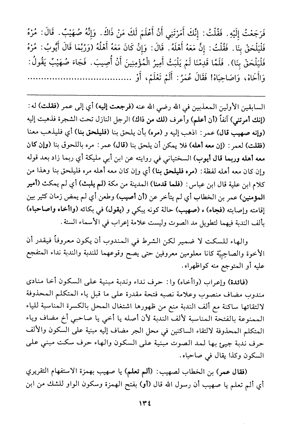 فَرَجَعْتُ إِلَيهِ. فَقُلْتُ: إِنَّكَ أَمَرْتَنِي أَنْ أَعْلَمَ لَكَ مَنْ ذَاكَ. وَإِنَّهُ صُهَيبٌ. قَال: مُرْهُ فَلْيَلْحَقْ بِنَا. فَقُلْتُ: إِنَّ مَعَهُ أَهْلَهُ. قَال: وَإِنْ كَانَ مَعَهُ أَهْلُهُ (وَرُبَّمَا قَال أَيُّوبُ: مُرْهُ فَلْيَلْحَقْ بِنَا). فَلَمَّا قَدِمْنَا لَمْ يَلْبَثْ أَمِيرُ الْمُؤْمِنِينَ أَنْ أُصِيبَ. فَجَاءَ صُهَيبٌ يَقُولُ: وَاأَخَاهْ، وَاصَاحِبَاهْ! فَقَال عُمَرُ: أَلَمْ تَعْلَمْ، أَوْ