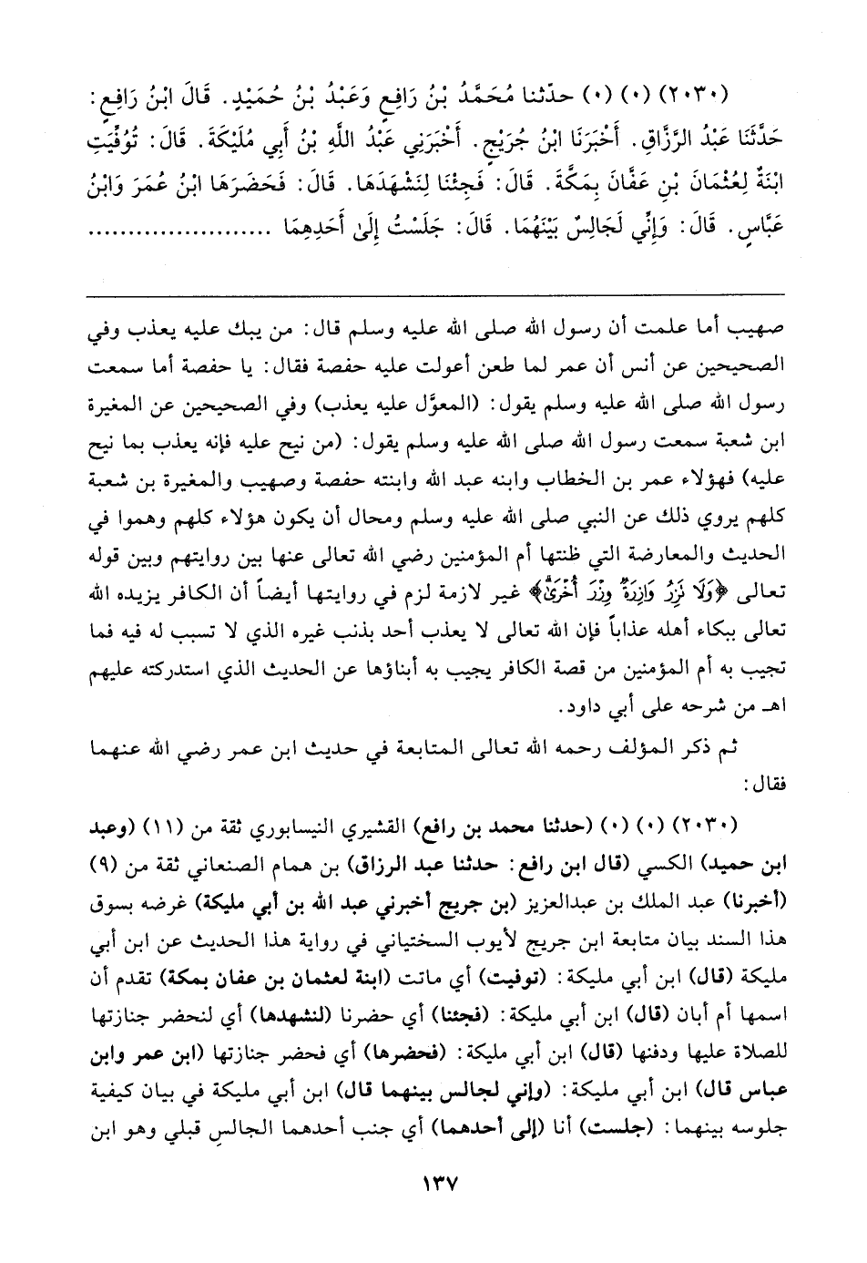 (٢٠٣٠) (٠) (٠) حدَّثنا مُحَمَّدُ بْنُ رَافِعٍ وَعَبْدُ بْنُ حُمَيدٍ. قَال ابْنُ رَافِعٍ: حَدَّثَنَا عَبْدُ الرَّزَّاقِ. أَخْبَرَنَا ابْنُ جُرَيجٍ. أَخْبَرَنِي عَبْدُ اللَّهِ بْنُ أَبِي مُلَيكَةَ. قَال: تُوُفِّيَتِ ابْنَةٌ لِعُثْمَانَ بْنِ عَفَّانَ بِمَكَّةَ. قَال: فَجِئْنَا لِنَشْهَدَهَا. قَال: فَحَضَرَهَا ابْنُ عُمَرَ وَابْنُ عَبَّاسٍ. قَال: وَإِنِّي لَجَالِسٌ بَينَهُمَا. قَال: جَلَسْتُ إِلَى أَحَدِهِمَا