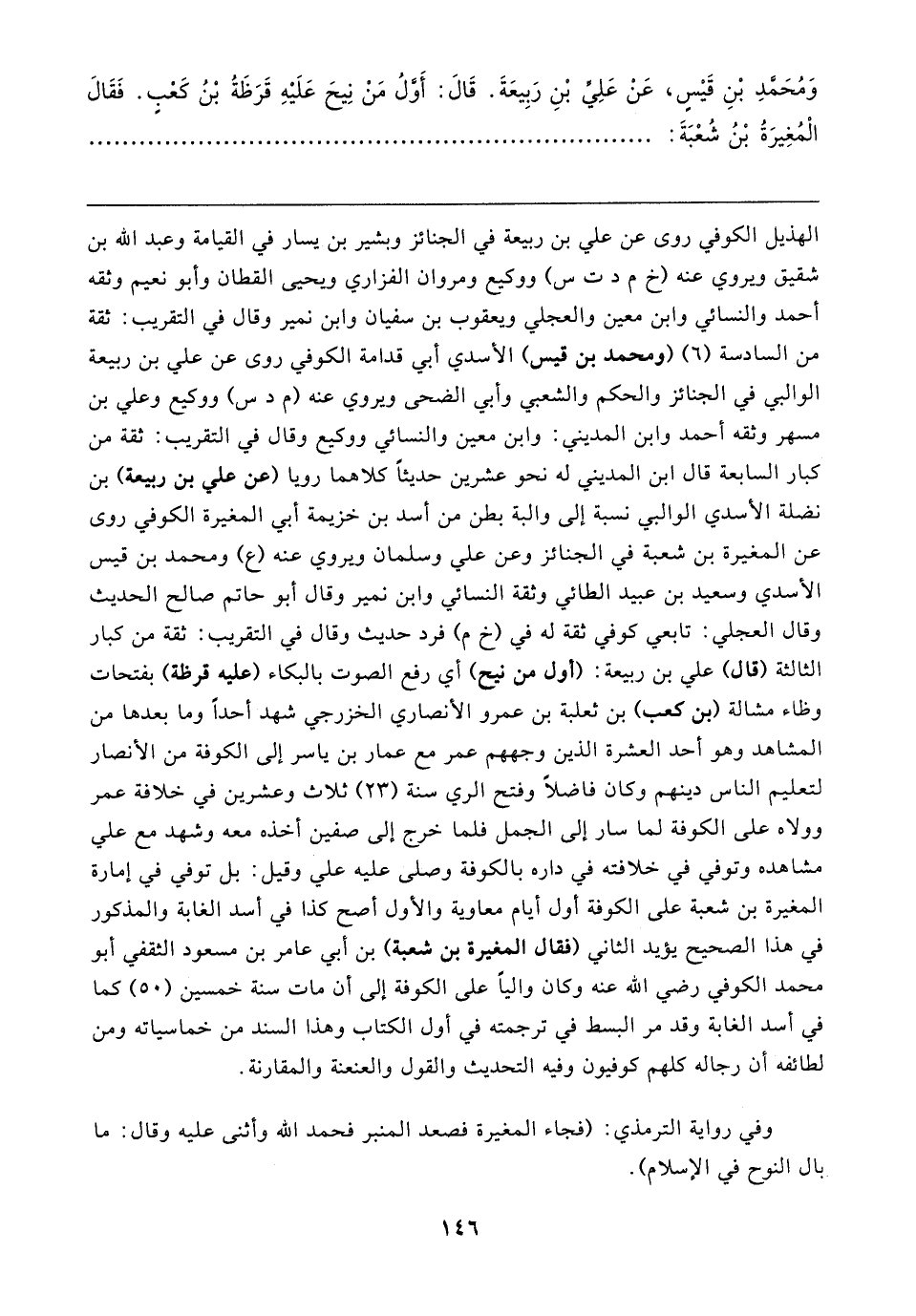 وَمُحَمَّدِ بْنِ قَيسٍ، عَنْ عَلِيِّ بْنِ رَبِيعَةَ. قَال: أَوَّلُ مَنْ نِيحَ عَلَيهِ قَرَظَةُ بْنُ كَعْبٍ. فَقَال الْمُغِيرَةُ بْنُ شُعْبَةَ: