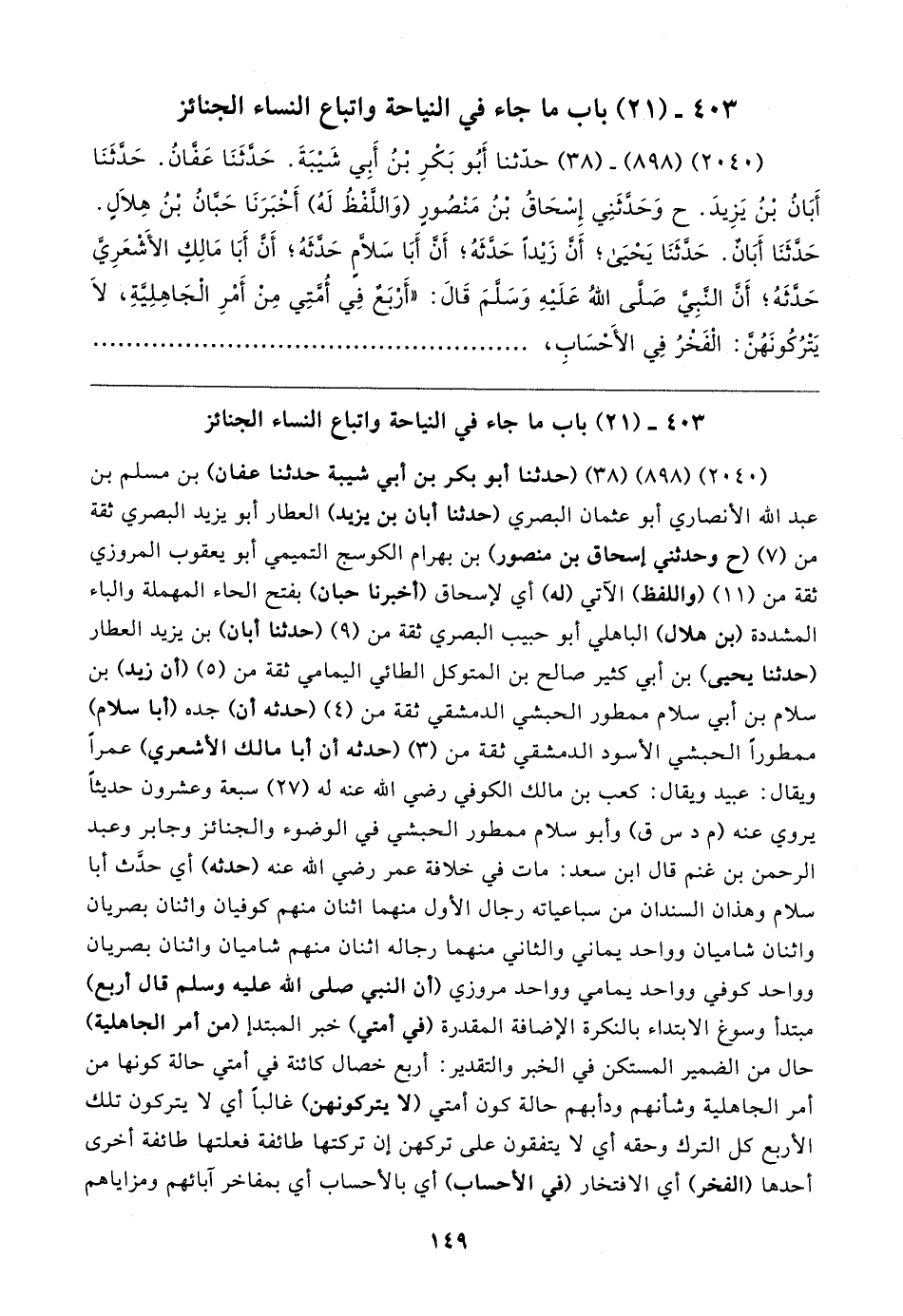 (٢٠٤٠) (٨٩٨) - (٣٨) حدَّثنا أَبُو بَكْرِ بْنُ أَبِي شَيبَةَ. حَدَّثَنَا عَفَّانُ. حَدَّثَنَا أَبَانُ بْنُ يَزِيدَ. ح وَحَدَّثَنِي إِسْحَاقُ بْنُ مَنْصُورٍ (وَاللَّفْظُ لَهُ) أَخْبَرَنَا حَبَّانُ بْنُ هِلالٍ. حَدَّثَنَا أَبَانٌ. حَدَّثَنَا يَحْيَى؛ أَنَّ زَيدًا حَدَّثَهُ؛ أَنَّ أَبَا سَلَّامِ حَدَّثَهُ؛ أَنَّ أَبَا مَالِكٍ الأَشْعَرِيَّ حَدَّثَهُ؛ أَن النَّبِيَّ صَلَّى اللهُ عَلَيهِ وَسَلَّمَ قَال: "أَرْبَعٌ فِي أُمَّتِي مِنْ أَمْرِ الْجَاهِلِيَّةِ، لَا يَتْرُكُونَهُنَّ: الْفَخْرُ فِي الأَحْسَابِ،