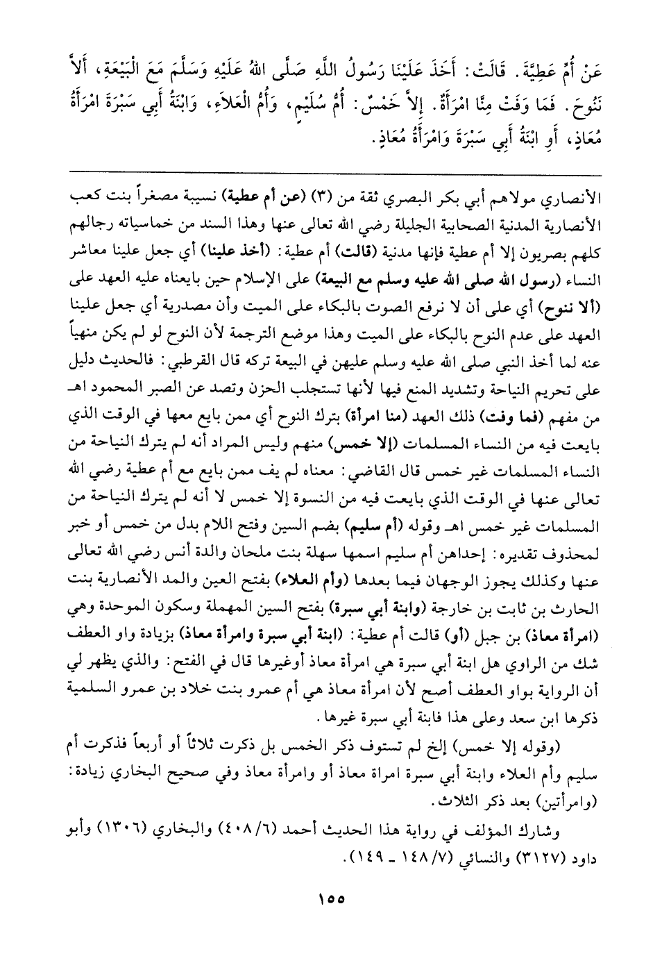 عَنْ أُمِّ عَطِيَّةَ. قَالتْ: أَخَذَ عَلَينَا رَسُولُ اللهِ صَلَّى اللهُ عَلَيهِ وَسَلَّمَ مَعَ الْبَيعَةِ، أَلَّا نَنُوحَ. فَمَا وَفَتْ مِنَّا امْرَأَةٌ. إلا خَمْسٌ: أُمِّ سُلَيمٍ، وَأُمُّ الْعَلاءِ، وَابْنَةُ أَبِي سَبْرَةَ امْرَأَةُ مُعَاذٍ، أَو ابْنَةُ أَبِي سَبْرَةَ وَامْرَأَةُ مُعَاذٍ