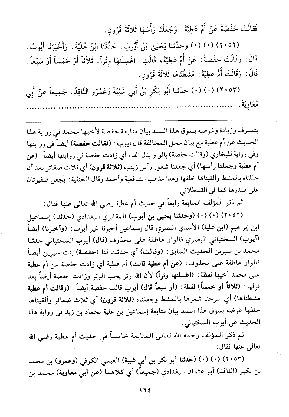 (٢٠٥٢) (٠) (٠) (وحدثنا يحيى بن أيوب) المقابري البغدادي (حدثنا) إسماعيل بن إبراهيم (ابن علية) الأسدي البصري قال إسماعيل أخبرنا غير أيوب: (وأخبرنا) أيضًا (أيوب) السختياني البصري فالواو عاطفة على محذوف (قال) أيوب السختياني حدثنا محمد بن سيرين الحديث السابق: (وقالت) أي حدثت لنا (حفصة) بنت سيرين أيضًا فالواو عاطفة على محذوف: (عن أم عطية قالت) أم عطية أي زادت حفصة عن أم عطية على محمد أخيها لفظة: (اغسلنها وترًا) لأن الله وتر يحب الوتر وزادت حفصة أيضًا بعد قولها: (ثلاثًا أو خمسًا) لفظة: (أو سبعًا قال) أيوب قالت حفصة أيضًا: (وقالت أم عطية مشطناها) أي سرحنا شعرها بالمشط وجعلناه (ثلاثة قرون) أي ثلاث ضفائر وألقيناها خلفها غرضه بسوق هذا السند بيان متابعة إسماعيل بن علية لحماد بن زيد في رواية هذا الحديث عن أيوب السختياني.