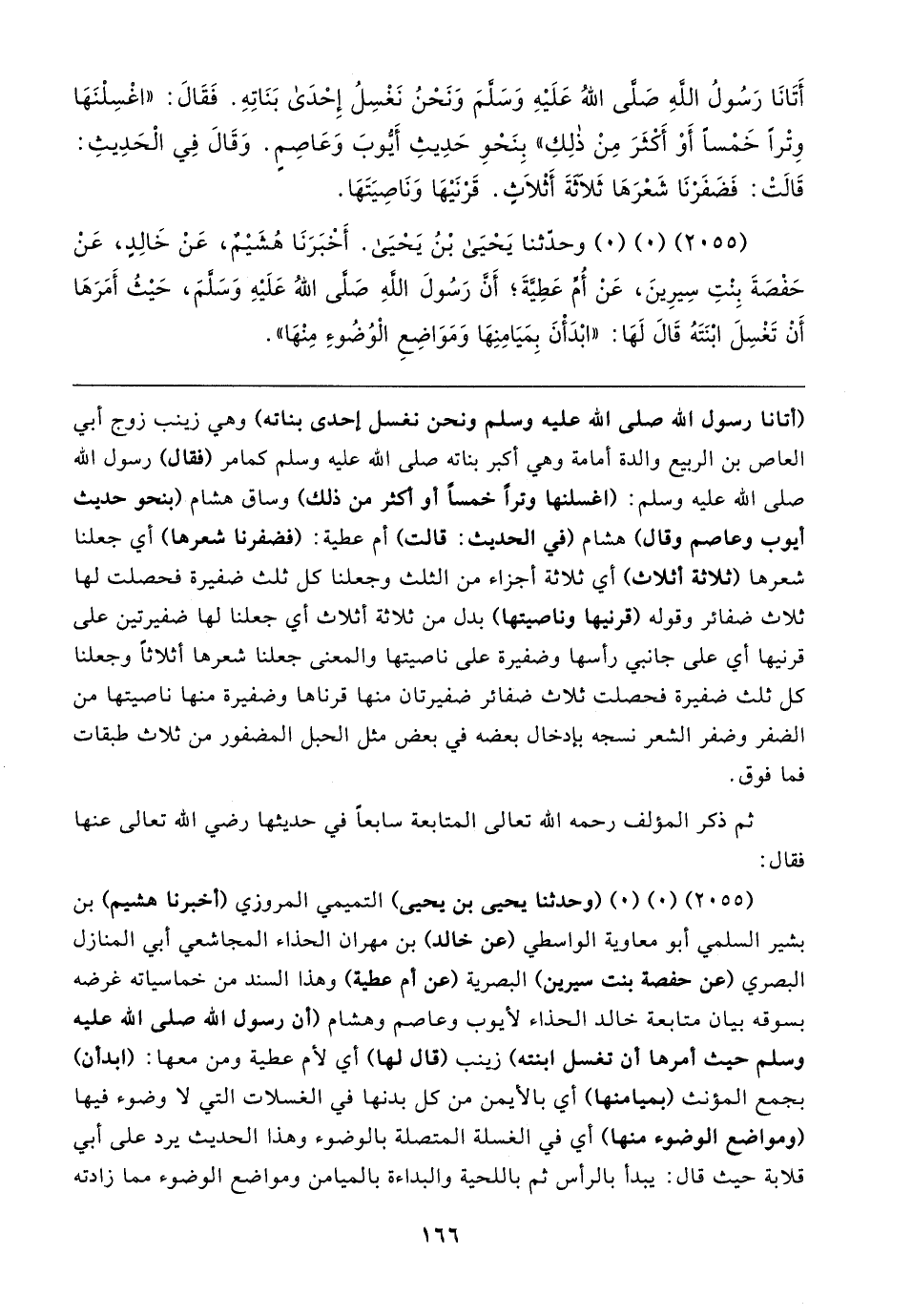 (٢٠٥٥) (٠) (٠) (وحدثنا يحيى بن يحيى) التميمي المروزي (أخبرنا هشيم) بن بشير السلمي أبو معاوية الواسطي (عن خالد) بن مهران الحذاء المجاشعي أبي المنازل البصري (عن حفصة بنت سيرين) البصرية (عن أم عطية) وهذا السند من خماسياته غرضه بسوقه بيان متابعة خالد الحذاء لأيوب وعاصم وهشام (أن رسول الله صلى الله عليه وسلم حيث أمرها أن نغسل ابنته) زينب (قال لها) أي لأم عطية ومن معها: (ابدأن) بجمع المؤنث (بميامنها) أي بالأيمن من كل بدنها في الغسلات التي لا وضوء فيها (ومواضع الوضوء منها) أي في الغسلة المتصلة بالوضوء وهذا الحديث يرد على أبي قلابة حيث قال: يبدأ بالرأس ثم باللحية والبداءة بالميامن ومواضع الوضوء مما زادته