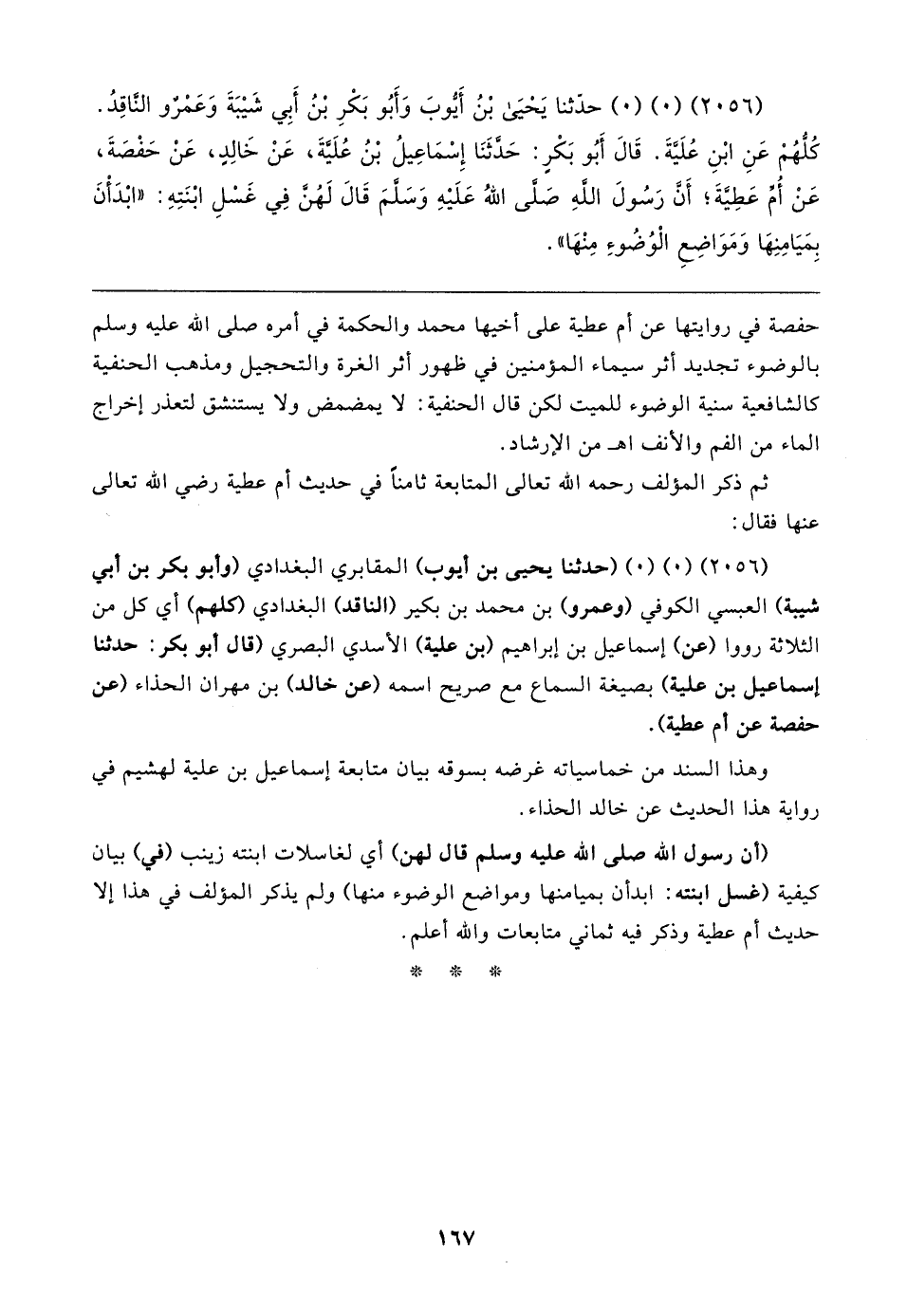 (٢٠٥٦) (٠) (٠) (حدثنا يحيى بن أيوب) المقابري البغدادي (وأبو بكر بن أبي شيبة) العبسي الكوفي (وعمرو) بن محمد بن بكير (الناقد) البغدادي (كلهم) أي كل من الثلاثة رووا (عن) إسماعيل بن إبراهيم (بن علية) الأسدي البصري (قال أبو بكر: حدثنا إسماعيل بن علية) بصيغة السماع مع صريح اسمه (عن خالد) بن مهران الحذاء (عن حفصة عن أم عطية).