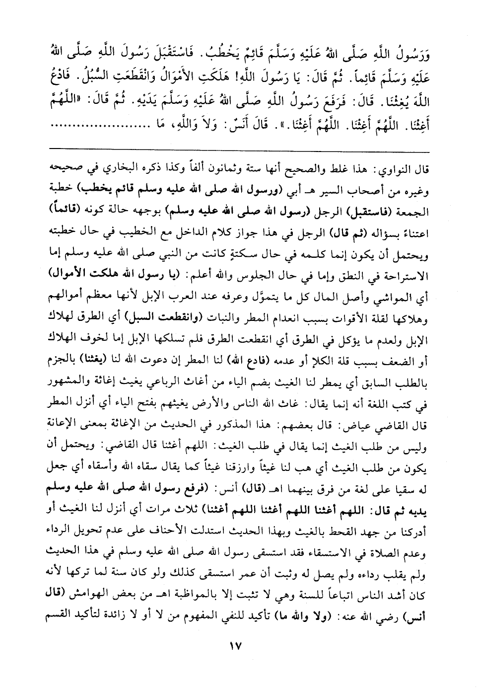 وَرَسُولُ اللهِ صلى الله عليه وسلم قَائِمٌ يَخْطُبُ. فَاسْتَقْبَلَ رَسُولَ اللهِ صلى الله عليه وسلم قَائِمًا. ثُمَّ قَال: يَا رَسُولَ اللَّهِ! هَلَكَتِ الأَمْوَالُ وَانْقَطَعَتِ السُّبُلُ. فَادْعُ اللهِ يُغِثْنَا. قَال: فَرَفَعَ رَسُولُ اللَّهِ صلى الله عليه وسلم يَدَيهِ. ثُمَّ قَال: "اللَّهُمَّ أَغِثْنَا. اللَّهُمَّ أَغِثْنَا. اللَّهُمَّ أَغِثْنَا.". قَال أَنَسٌ: وَلَا وَاللهِ, مَا