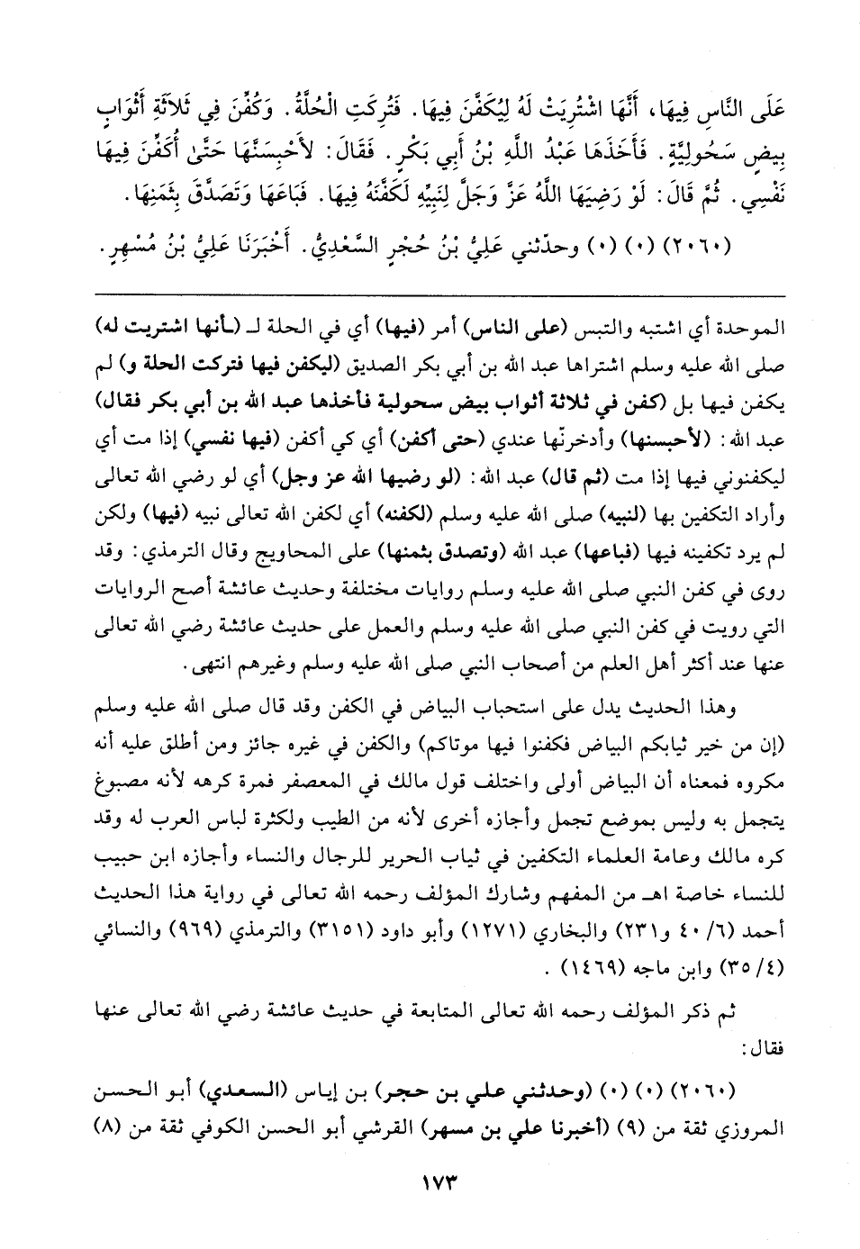 وهذا الحديث يدل على استحباب البياض في الكفن وقد قال صلى الله عليه وسلم (إن من خير ثيابكم البياض فكفنوا فيها موتاكم) والكفن في غيره جائز ومن أطلق عليه أنه مكروه فمعناه أن البياض أولى واختلف قول مالك في المعصفر فمرة كرهه لأنه مصبوغ يتجمل به وليس بموضع تجمل وأجازه أخرى لأنه من الطيب ولكثرة لباس العرب له وقد كره مالك وعامة العلماء التكفين في ثياب الحرير للرجال والنساء وأجازه ابن حبيب للنساء خاصة اهـ من المفهم وشارك المؤلف رحمه الله تعالى في رواية هذا الحديث أحمد (٦/ ٤٠ و ٢٣١) والبخاري (١٢٧١) وأبو داود (٣١٥١) والترمذي (٩٦٩) والنسائي (٤/ ٣٥) وابن ماجه (١٤٦٩).