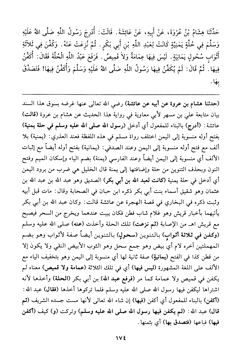 حَدَّثَنَا هِشَامُ بْنُ عُرْوَةَ، عَنْ أَبِيهِ، عَنْ عَائِشَةَ. قَالتْ: أُدْرِجَ رَسُولُ اللهِ صَلَّى اللهُ عَلَيهِ وَسَلَّمَ فِي حُلَّةٍ يَمَنِيةٍ كَانَتْ لِعَبْدِ اللهِ بْنِ أَبِي بَكْرٍ. ثُمَّ نُزِعَتْ عَنْهُ. وَكُفِّنَ فِي ثَلاثَةِ أَثْوَاب سُحُولٍ يَمَانِيَةٍ. لَيسَ فِيهَا عِمَامَةٌ وَلَا قَمِيصٌ. فَرَفَعَ عَبْدُ اللهِ الْحُلَّةَ فَقَال: أُكَفَّنُ فِيهَا. ثُمَّ قَال: لَمْ يُكَفَّنْ فِيهَا رَسُولُ اللهِ صَلَّى اللهُ عَلَيهِ وَسَلَّمَ وَأُكَفَّنُ فِيهَا! فَتَصَدَّقَ بِهَا
