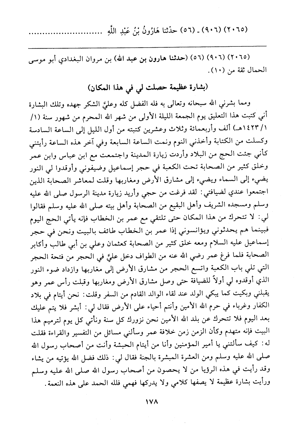 ومما بشرني الله سبحانه وتعالى به فله الفضل كله وعليَّ الشكر جهده وتلك البشارة أني كتبت هذا التعليق يوم الجمعة الليلة الأولى من شهر الله المحرم من شهور سنة (١/ ١ / ١٤٢٣ هـ) ألف وأربعمائة وثلاث وعشرين كتبته من أول الليل إلى الساعة السادسة وكسلت من الكتابة وأخذني النوم ونمت الساعة السابعة وفي آخر هذه الساعة رأيتني كأني جئت الحج من البلاد وأردت زيارة المدينة واجتمعت مع ابن عباس وابن عمر وخلق كثير من الصحابة تحت الكعبة في حجر إسماعيل وضيفوني وأوقدوا لي النور يضيء إلى السماء ويضيء إلى مشارق الأرض ومغاربها وقلت لمعاشر الصحابة الذين اجتمعوا عندي لضيافتي: لقد فرغت من حجي وأريد زيارة مدينة الرسول صلى الله عليه وسلم ومسجده الشريف وأهل البقيع من الصحابة وأهل بيته صلى الله عليه وسلم فقالوا لي: لا تتحرك من هذا المكان حتى تلتقي مع عمر بن الخطاب فإنه يأتي الحج اليوم فبينما هم يحدثوني ويؤانسوني إذا عمر بن الخطاب طائف بالبيت ونحن في حجر إسماعيل - عليه السلام - ومعه خلق كثير من الصحابة كعثمان وعلي بن أبي طالب وأكابر الصحابة فلما فرغ عمر رضي الله عنه من الطواف دخل علي في الحجر من فتحة الحجر التي تلي باب الكعبة واتسع الحجر من مشارق الأرض إلى مغاربها وازداد ضوء النور الذي أوقدوه لي أولًا للضيافة حتى وصل مشارق الأرض ومغاربها وقبلت رأس عمر وهو يقبلني وبكيت كما يبكي الولد عند لقاء الوالد القادم من السفر وقلت: نحن أيتام في بلاد الكفار وغرباء في حرم الله الأمين وأنتم أحياء على الأرض فقال لي: أبشر فلا يتم عليك بعد اليوم فلا تتحرك عن بلد الله الأمين نحن نزورك كل سنة ونأتي كل يوم لترميم هذا البيت فإنه متهدم وكأن الزمن زمن خلافة عمر وسألني مسائل من التفسير والقراءة فقلت له: كيف سألتني يا أمير المؤمنين وأنا من أيتام الحبشة وأنت من أصحاب رسول الله صلى الله عليه وسلم ومن العشرة المبشرة بالجنة فقال لي: ذلك فضل الله يؤتيه من يشاء وقد رأيت في هذه الرؤيا من لا يحصون من أصحاب رسول الله صلى الله عليه وسلم ورأيت بشارة عظيمة لا يصفها كلامي ولا يدركها فهمي فلله الحمد على هذه النعمة.