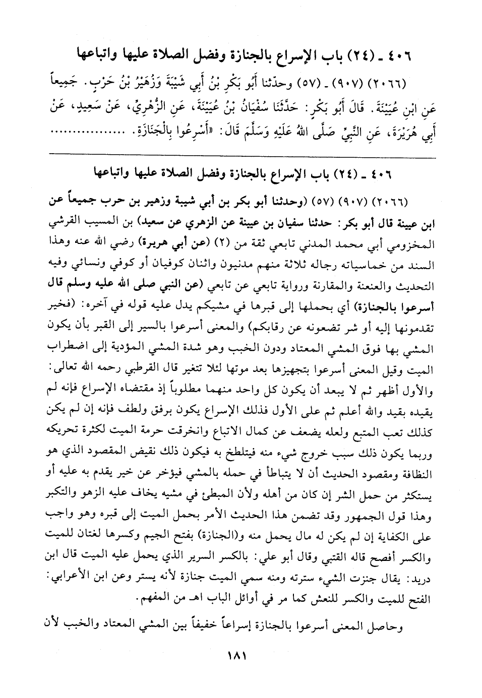 (٢٠٦٦) (٩٠٧) - (٥٧) وحدّثنا أَبُو بَكْرِ بْنُ أَبِي شَيبَةَ وَزُهَيرُ بْنُ حَرْبٍ. جَمِيعًا عَنِ ابْنِ عُيَينَةَ. قَال أَبُو بَكْرٍ: حَدَّثَنَا سُفْيَانُ بْنُ عُيَينَةَ، عَنِ الزُّهْرِيِّ، عَنْ سَعِيدٍ، عَنْ أَبِي هُرَيرَةَ، عَنِ النَّبِيِّ صَلَّى اللهُ عَلَيهِ وَسَلَّمَ قَال: "أَسْرِعُوا بِالْجَنَازَةِ