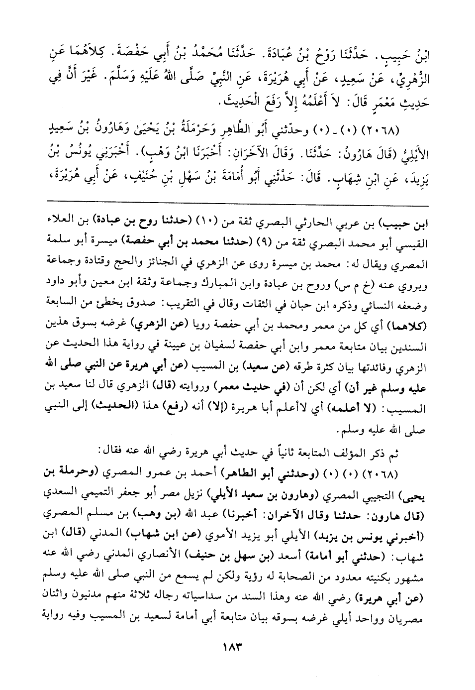 (٢٠٦٨) (٠) (٠) (وحدثني أبو الطاهر) أحمد بن عمرو المصري (وحرملة بن بحيى) التجيبي المصري (وهارون بن سعيد الأيلي) نزيل مصر أبو جعفر التميمي السعدي (قال هارون: حدثنا وقال الآخران: أخبرنا) عبد الله (بن وهب) بن مسلم المصري (أخبرني يونس بن يزيد) الأيلي أبو يزيد الأموي (عن ابن شهاب) المدني (قال) ابن شهاب: (حدثني أبو أمامة) أسعد (بن سهل بن حنيف) الأنصاري المدني رضي الله عنه مشهور بكنيته معدود من الصحابة له رؤية ولكن لم يسمع من النبي صلى الله عليه وسلم (عن أبي هريرة) رضي الله عنه وهذا السند من سداسياته رجاله ثلاثة منهم مدنيون واثنان مصريان وواحد أيلي غرضه بسوقه بيان متابعة أبي أمامة لسعيد بن المسيب وفيه رواية
