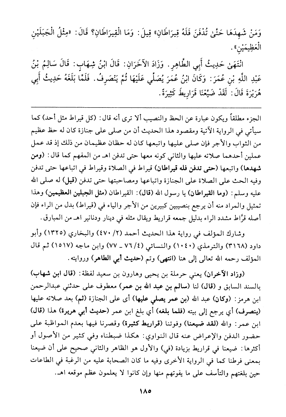 انْتَهَى حَدِيثُ أَبِي الطَّاهِرِ. وَزَادَ الآخَرَانِ: قَال ابْنُ شِهَابٍ: قَال سَالِمُ بْنُ عَبْدِ اللهِ بْنِ عُمَرَ: وَكَانَ ابْنُ عُمَرَ يُصَلِّي عَلَيهَا ثُمَّ يَنْصَرِفُ. فَلَمَّا بَلَغَهُ حَدِيثُ أَبِي هُرَيرَةَ قَال: لَقَدْ ضَيَّعْنَا قَرَارِيطَ كَثِيرَةً