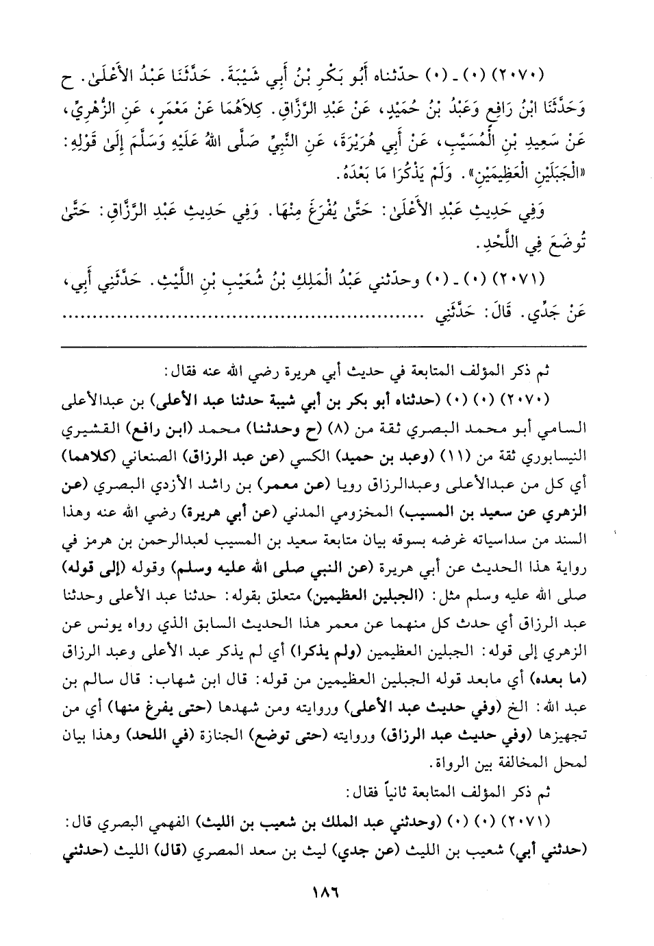 (٢٠٧٠) (٠) (٠) (حدثناه أبو بكر بن أبي شيبة حدثنا عبد الأعلى) بن عبد الأعلى السامي أبو محمد البصري ثقة من (٨) (ح وحدثنا) محمد (ابن رافع) القشيري النيسابوري ثقة من (١١) (وعبد بن حمبد) الكسي (عن عبد الرزاق) الصنعاني (كلاهما) أي كل من عبد الأعلى وعبد الرزاق رويا (عن معمر) بن راشد الأزدي البصري (عن الزهري عن سعيد بن المسبب) المخزومي المدني (عن أبي هريرة) رضي الله عنه وهذا السند من سداسياته غرضه بسوقه بيان متابعة سعيد بن المسيب لعبد الرحمن بن هرمز في رواية هذا الحديث عن أبي هريرة (عن النبي صلى الله عليه وسلم) وقوله (إلى قوله) صلى الله عليه وسلم مثل: (الجبلين العظيمين) متعلق بقوله: حدثنا عبد الأعلى وحدثنا عبد الرزاق أي حدث كل منهما عن معمر هذا الحديث السابق الذي رواه يونس عن الزهري إلى قوله: الجبلين العظيمين (ولم يذكرا) أي لم يذكر عبد الأعلى وعبد الرزاق (ما بعده) أي ما بعد قوله الجبلين العظيمين من قوله: قال ابن شهاب: قال سالم بن عبد الله: الخ (وفي حديث عبد الأعلى) وروايته ومن شهدها (حتى يفرغ منها) أي من تجهيزها (وفي حديث عبد الرزاق) وروايته (حتى توضع) الجنازة (في اللحد) وهذا بيان لمحل المخالفة بين الرواة.