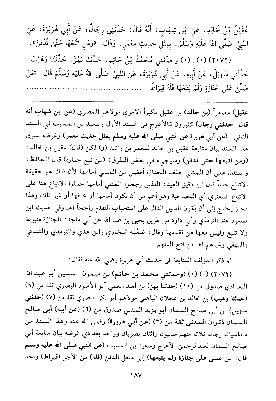 (٢٠٧٢) (٠) (٠) (وحدثني محمد بن حاتم) بن ميمون السمين أبو عبد الله البغدادي صدوق من (١٠) (حدثنا بهز) بن أسد العمي أبو الأسود البصري ثقة من (٩) (حدثنا وهيب) بن خالد بن عجلان الباهلي مولاهم أبو بكر البصري ثقة من (٧) (حدثني سهيل) بن أبي صالح السمان أبو يزيد المدني صدوق من (٦) (عن أبيه) أبي صالح السمان ذكوان المدني ثقة من (٣) (عن أبي هريرة) رضي الله عنه وهذا السند من سداسياته رجاله ثلاثة منهم مدنيون واثنان بصريان وواحد بغدادي غرضه بيان متابعة أبي صالح السمان لعبد الرحمن الأعرج وسعيد بن المسيب (عن النبي صلى الله عليه وسلم قال: من صلى على جنازة ولم يتبعها) إلى محل الدفن (فله) من الأجر (قيراط) واحد