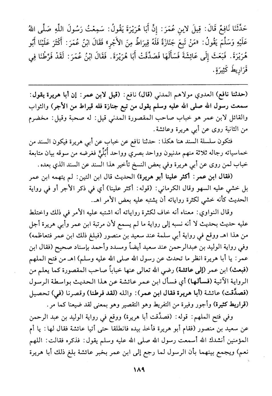 حَدَّثَنَا نَافِع قَال: قِيلَ لابنِ عُمَرَ: إِن أَبَا هُرَيرَةَ يَقُولُ: سَمِعْتُ رَسُولَ اللهِ صَلَّى اللهُ عَلَيهِ وَسَلَّمَ يَقُولُ: "مَنْ تَبعَ جَنَازَة فَلَهُ قِيرَاطٌ مِنَ الأَجْرِ" فَقَال ابْنُ عُمَرَ: أَكْثَرَ عَلَينَا أَبُو هُرَيرَةَ. فَبَعَثَ إِلَى عَائِشَةَ فَسَأَلَهَا فَصَدَّقَتْ أَبَا هُرَيرَةَ. فَقَال ابْنُ عُمَرَ: لَقَدْ فَرَّطْنَا فِي قَرَارِيطَ كَثِيرَةٍ