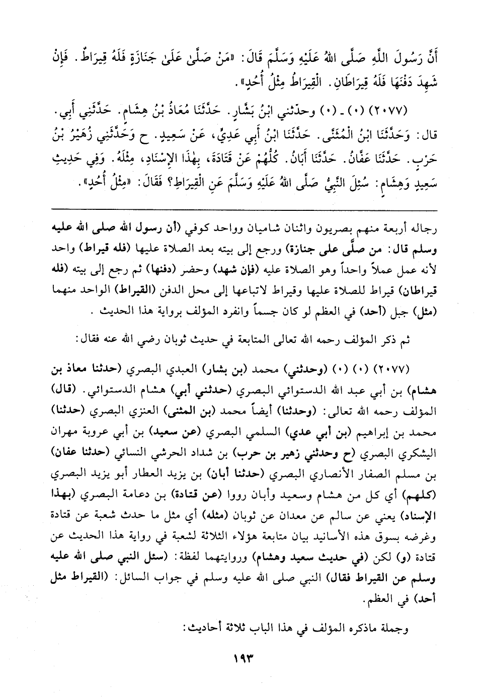 (٢٠٧٧) (٠) (٠) (وحدثني) محمد (بن بشار) العبدي البصري (حدثنا معاذ بن هشام) بن أبي عبد الله الدستوائي البصري (حدثني أبي) هشام الدستوائي. (قال) المؤلف رحمه الله تعالى: (وحدثنا) أيضًا محمد (بن المثنى) العنزي البصري (حدثنا) محمد بن إبراهيم (بن أبي عدي) السلمي البصري (عن سعيد) بن أبي عروبة مهران اليشكري البصري (ح وحدثني زهير بن حرب) بن شداد الحرشي النسائي (حدثنا عفان) بن مسلم الصفار الأنصاري البصري (حدثنا أبان) بن يزيد العطار أبو يزيد البصري (كلهم) أي كل من هشام وسعيد وأبان رووا (عن قتادة) بن دعامة البصري (بهذا الإسناد) يعني عن سالم عن معدان عن ثوبان (مثله) أي مثل ما حدث شعبة عن قتادة وغرضه بسوق هذه الأسانيد بيان متابعة هؤلاء الثلاثة لشعبة في رواية هذا الحديث عن قتادة (و) لكن (في حديث سعيد وهشام) وروايتهما لفظة: (سئل النبي صلى الله عليه وسلم عن القيراط فقال) النبي صلى الله عليه وسلم في جواب السائل: (القيراط مثل أحد) في العظم.