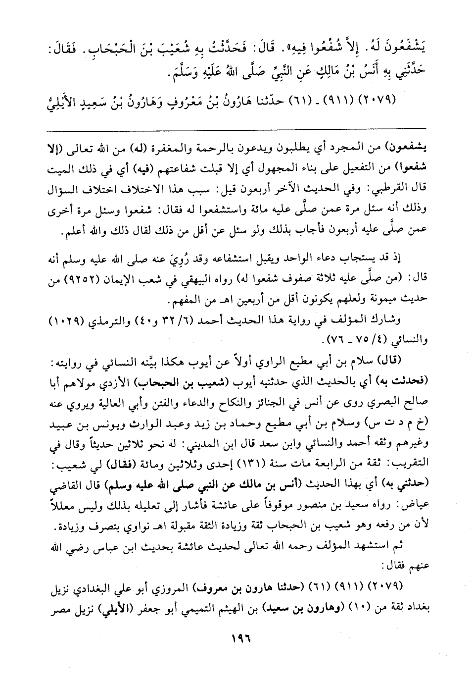 يَشْفَعُونَ لَهُ. إلا شُفِّعُوا فِيهِ". قَال: فَحَدَّثْتُ بِهِ شُعَيبَ بْنَ الْحَبْحَابِ. فَقَال: حَدَّثَنِي بِهِ أَنَسُ بْنُ مَالِكٍ عَنِ النَّبِيِّ صَلَّى اللهُ عَلَيهِ وَسَلَّمَ.