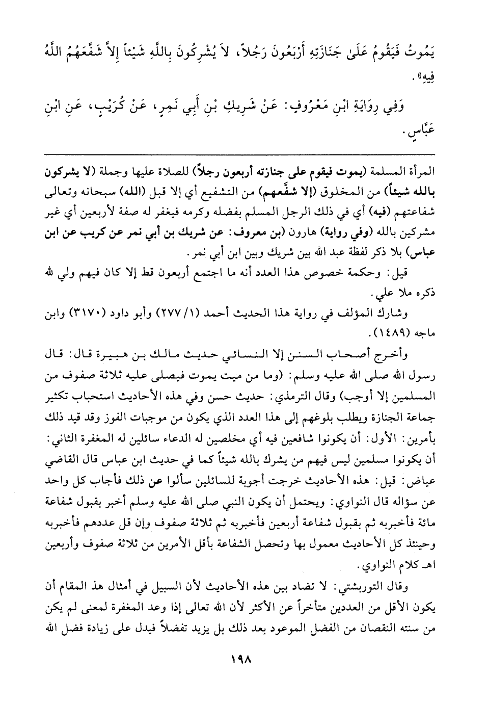 وأخرج أصحاب السنن إلا النسائي حديث مالك بن هبيرة قال: قال رسول الله صلى الله عليه وسلم: (وما من ميت يموت فيصلى عليه ثلاثة صفوف من المسلمين إلا أوجب) وقال الترمذي: حديث حسن وفي هذه الأحاديث استحباب تكثير جماعة الجنازة ويطلب بلوغهم إلى هذا العدد الذي يكون من موجبات الفوز وقد قيد ذلك بأمرين: الأول: أن يكونوا شافعين فيه أي مخلصين له الدعاء سائلين له المغفرة الثاني: أن يكونوا مسلمين ليس فيهم من يشرك بالله شيئًا كما في حديث ابن عباس قال القاضي عياض: قيل: هذه الأحاديث خرجت أجوبة للسائلين سألوا عن ذلك فأجاب كل واحد عن سؤاله قال النواوي: ويحتمل أن يكون النبي صلى الله عليه وسلم أخبر بقبول شفاعة مائة فأخبر به ثم بقبول شفاعة أربعين فأخبر به ثم ثلاثة صفوف وإن قل عددهم فأخبر به وحينئذ كل الأحاديث معمول بها وتحصل الشفاعة بأقل الأمرين من ثلاثة صفوف وأربعين اهـ كلام النواوي.