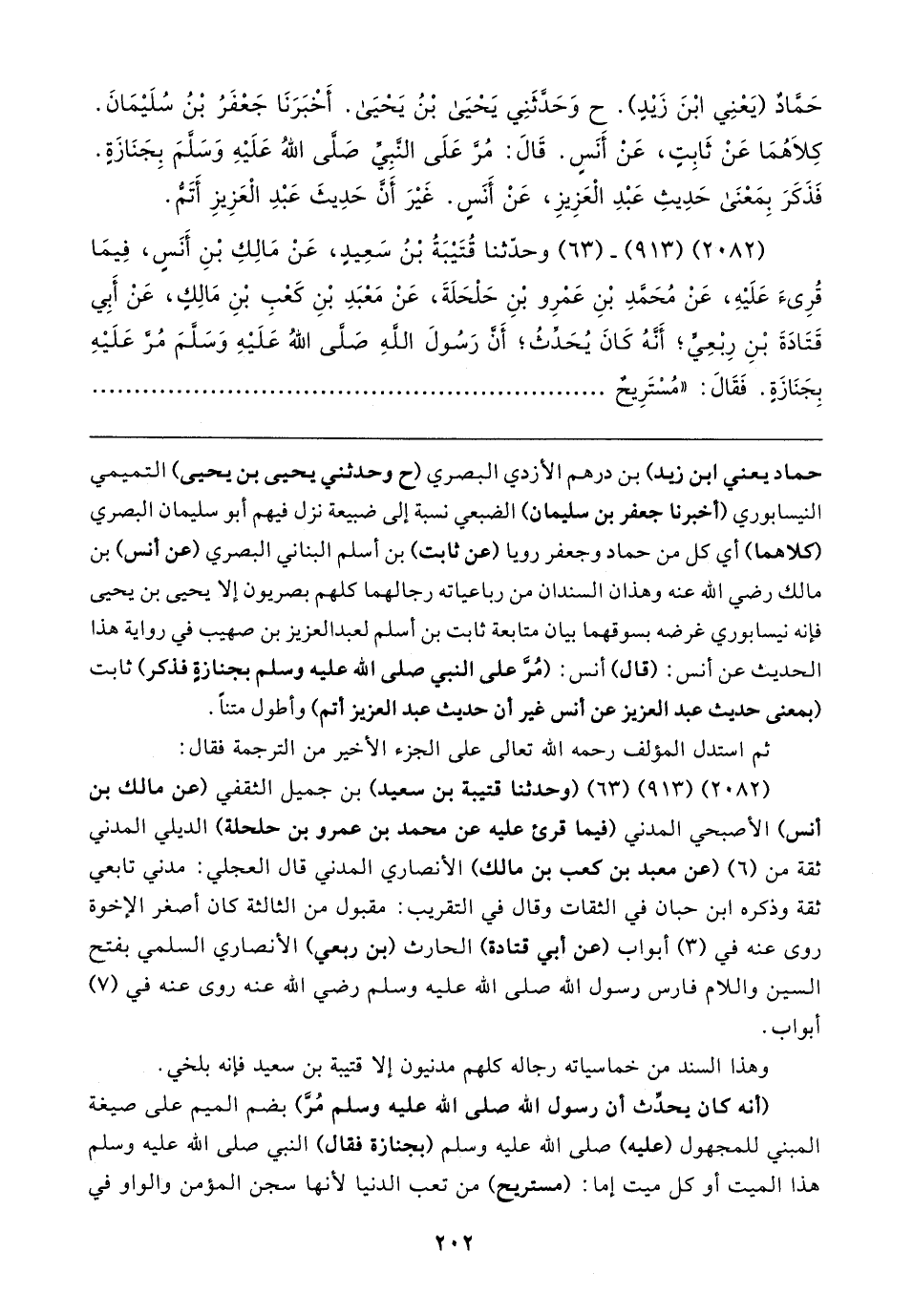 حماد يعني ابن زيد) بن درهم الأزدي البصري (ح وحدثني يحيى بن يحيى) التميمي النيسابوري (أخبرنا جعفر بن سليمان) الضبعي نسبة إلى ضبيعة نزل فيهم أبو سليمان البصري (كلاهما) أي كل من حماد وجعفر رويا (عن ثابت) بن أسلم البناني البصري (عن أنس) بن مالك رضي الله عنه وهذان السندان من رباعياته رجالهما كلهم بصريون إلا يحيى بن يحيى فإنه نيسابوري غرضه بسوقهما بيان متابعة ثابت بن أسلم لعبد العزيز بن صهيب في رواية هذا الحديث عن أنس: (قال) أنس: (مُرَّ على النبي صلى الله عليه وسلم بجنازةٍ فذكر) ثابت (بمعنى حديث عبد العزيز عن أنس غير أن حديث عبد العزيز أتم) وأطول متنًا.
