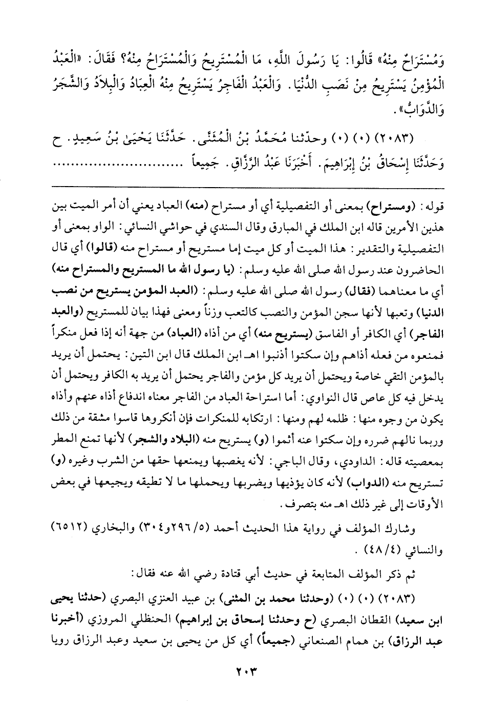 قوله: (ومستراح) بمعنى أو التفصيلية أي أو مستراح (منه) العباد يعني أن أمر الميت بين هذين الأمرين قاله ابن الملك في المبارق وقال السندي في حواشي النسائي: الواو بمعنى أو التفصيلية والتقدير: هذا الميت أو كل ميت إما مستريح أو مستراح منه (قالوا) أي قال الحاضرون عند رسول الله صلى الله عليه وسلم: (يا رسول الله ما المستريح والمستراح منه) أي ما معناهما (فقال) رسول الله صلى الله عليه وسلم: (العبد المؤمن يستريح من نصب الدنيا) وتعبها لأنها سجن المؤمن والنصب كالتعب وزنًا ومعنى فهذا بيان للمستريح (والعبد الفاجر) أي الكافر أو الفاسق (يستريح منه) أي من أذاه (العباد) من جهة أنه إذا فعل منكرًا فمنعوه من فعله أذاهم وإن سكتوا أذنبوا اهـ ابن الملك قال ابن التين: يحتمل أن يريد بالمؤمن التقي خاصة ويحتمل أن يريد كل مؤمن والفاجر يحتمل أن يريد به الكافر ويحتمل أن يدخل فيه كل عاص قال النواوي: أما استراحة العباد من الفاجر معناه اندفاع أذاه عنهم وأذاه يكون من وجوه منها: ظلمه لهم ومنها: ارتكابه للمنكرات فإن أنكروها قاسوا مشقة من ذلك وربما نالهم ضرره وإن سكتوا عنه أثموا (و) يستريح منه (البلاد والشجر) لأنها تمنع المطر بمعصيته قاله: الداودي، وقال الباجي: لأنه يغصبها ويمنعها حقها من الشرب وغيره (و) تستريح منه (الدواب) لأنه كان يؤذيها ويضربها ويحملها ما لا تطيقه ويجيعها في بعض الأوقات إلى غير ذلك اهـ منه بتصرف.