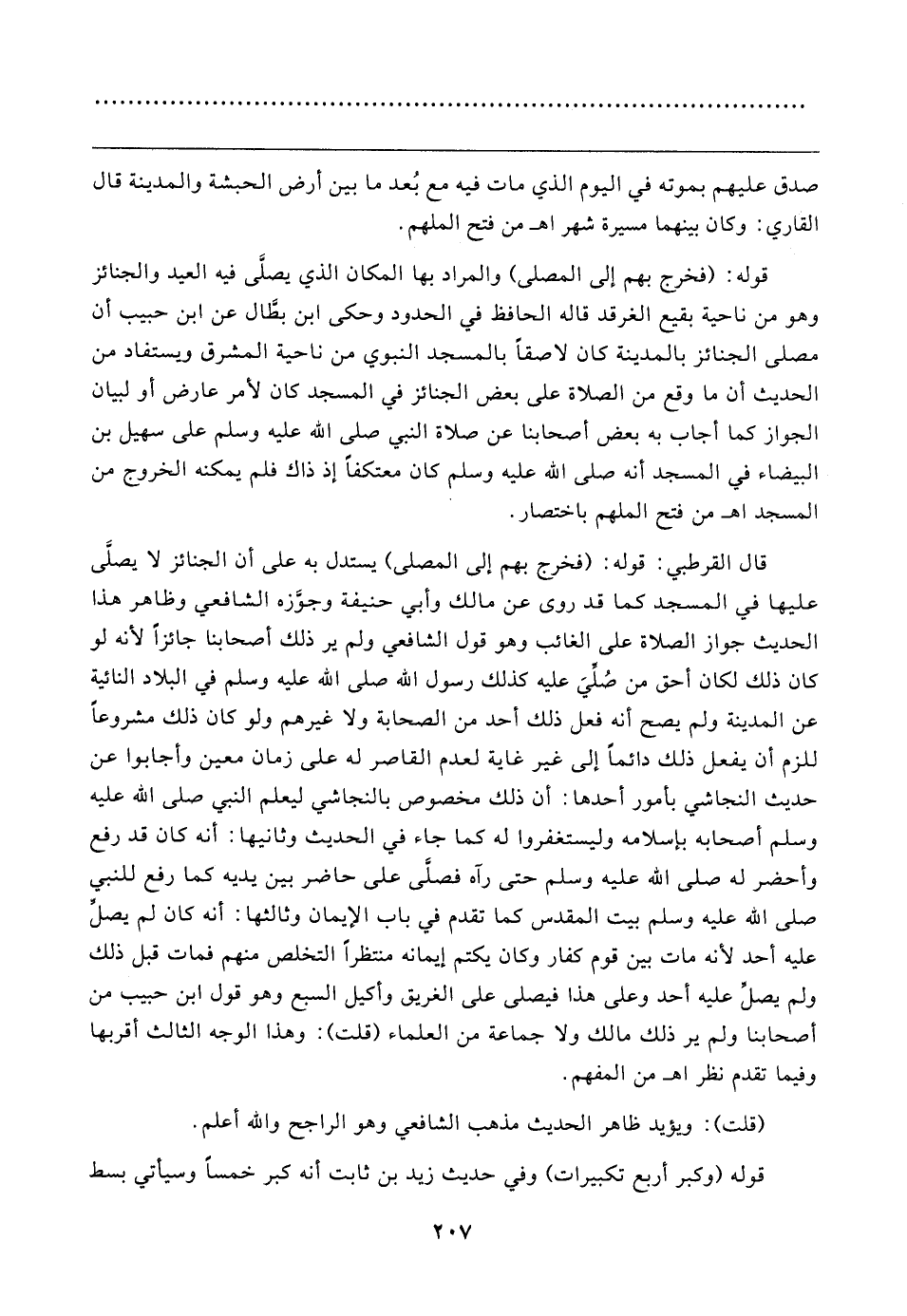 قال القرطبي: قوله: (فخرج بهم إلى المصلى) يستدل به على أن الجنائز لا يصلّى عليها في المسجد كما قد روى عن مالك وأبي حنيفة وجوَّزه الشافعي وظاهر هذا الحديث جواز الصلاة على الغائب وهو قول الشافعي ولم ير ذلك أصحابنا جائزًا لأنه لو كان ذلك لكان أحق من صُلِّيَ عليه كذلك رسول الله صلى الله عليه وسلم في البلاد النائية عن المدينة ولم يصح أنه فعل ذلك أحد من الصحابة ولا غيرهم ولو كان ذلك مشروعًا للزم أن يفعل ذلك دائمًا إلى غير غاية لعدم القاصر له على زمان معين وأجابوا عن حديث النجاشي بأمور أحدها: أن ذلك مخصوص بالنجاشي ليعلم النبي صلى الله عليه وسلم أصحابه بإسلامه وليستغفروا له كما جاء في الحديث وثانيها: أنه كان قد رفع وأحضر له صلى الله عليه وسلم حتى رآه فصلَّى على حاضر بين يديه كما رفع للنبي صلى الله عليه وسلم بيت المقدس كما تقدم في باب الإيمان وثالثها: أنه كان لم يصل عليه أحد لأنه مات بين قوم كفار وكان يكتم إيمانه منتظرًا التخلص منهم فمات قبل ذلك ولم يصلِّ عليه أحد وعلى هذا فيصلى على الغريق وأكيل السبع وهو قول ابن حبيب من أصحابنا ولم ير ذلك مالك ولا جماعة من العلماء (قلت): وهذا الوجه الثالث أقربها وفيما تقدم نظر اهـ من المفهم.