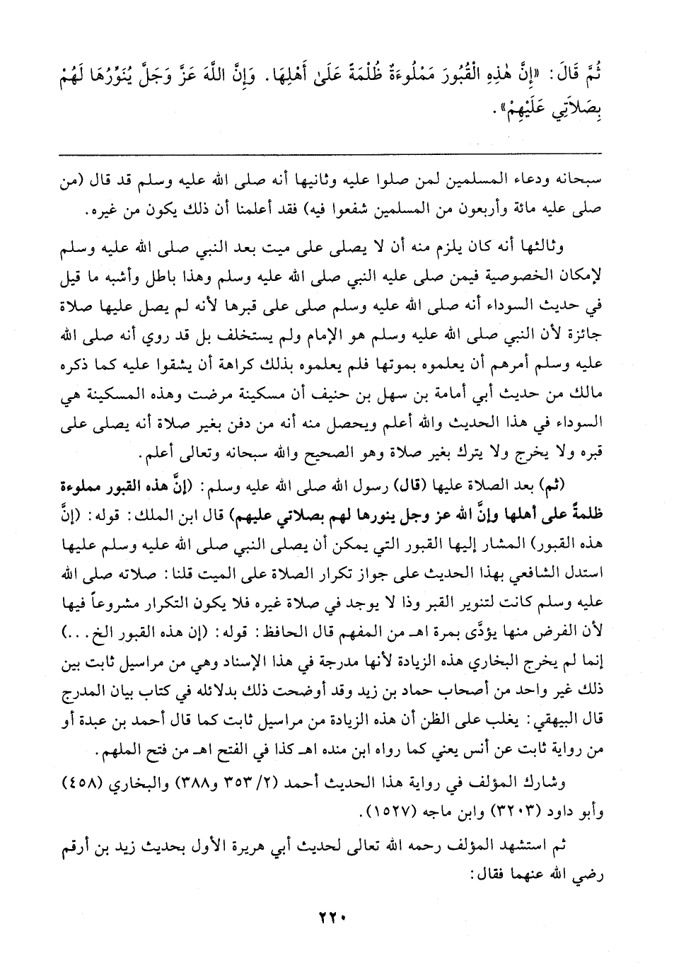 ثُمَّ قَال: "إِن هذِهِ الْقُبُورَ مَمْلُوءَةٌ ظُلْمَةً عَلَى أَهْلِهَا. وَإِن اللهَ عَز وَجَل يُنَوِّرُهَا لَهُمْ بِصَلاتِي عَلَيهِمْ"
