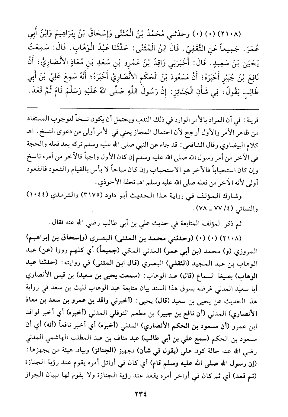 (٢١٠٨) (٠) (٠) (وحدثني محمد بن المثنى) البصري (وإسحاق بن إبراهيم) المروزي (و) محمد (بن أبي عمر) العدني المكي (جميعًا) أي كلهم رووا (عن) عبد الوهاب بن عبد المجيد (الثقفي) البصري (قال ابن المثنى) في روايته: (حدثنا عبد الوهاب) بصيغة السماع (قال) عبد الوهاب: (سمعت يحيى بن سعيد) بن قيس الأنصاري أبا سعيد المدني غرضه بسوق هذا السند بيان متابعة عبد الوهاب لليث بن سعد في رواية هذا الحديث عن يحيى بن سعيد (قال) يحيى: (أخبرني واقد بن عمرو بن سعد بن معاذ الأنصاري) المدني (أن نافع بن جبير) بن مطعم النوفلي المدني (أخبره) أي أخبر لواقد بن عمرو (أن مسعود بن الحكم الأنصاري) المدني (أخبره) أي أخبر نافعًا (أنه) أي أن مسعود بن الحكم (سمع علي بن أبي طالب) عبد مناف بن عبد المطلب الهاشمي المدني رضي الله عنه حالة كون علي (يقول في شأن) تجهيز (الجنائز) وبيان هيئة من يجهزها: (أن رسول الله صلى الله عليه وسلم قام) أي كان في أوائل أمره يقوم عند رؤية الجنازة (ثم قعد) أي ثم كان في أواخر أمره يقعد عند رؤية الجنازة ولا يقوم لها لبيان الجواز