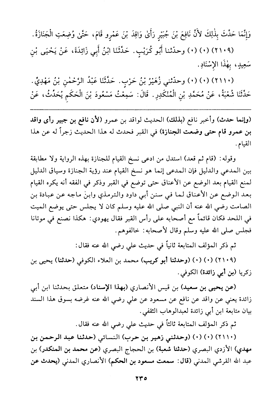 وَإِنَّمَا حَدَّثَ بِذلِكَ لأنَّ نَافِعَ بْنَ جُبَيرٍ رَأَى وَاقِدَ بْنَ عَمْرٍو قَامَ، حَتَّى وُضِعَتِ الْجَنَازَةُ.