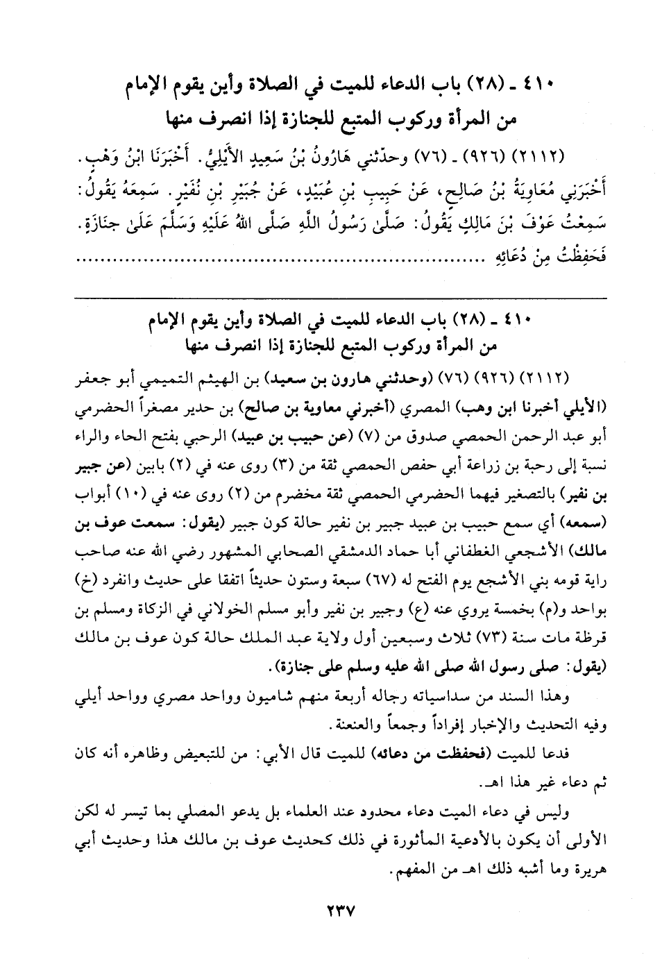 (٢١١٢) (٩٢٦) (٧٦) (وحدثني هارون بن سعيد) بن الهيثم التميمي أبو جعفر (الأيلي أخبرنا ابن وهب) المصري (أخبرني معاوية بن صالح) بن حدير مصغرًا الحضرمي أبو عبد الرحمن الحمصي صدوق من (٧) (عن حبيب بن عبيد) الرحبي بفتح الحاء والراء نسبة إلى رحبة بن زراعة أبي حفص الحمصي ثقة من (٣) روى عنه في (٢) بابين (عن جبير بن نفير) بالتصغير فيهما الحضرمي الحمصي ثقة مخضرم من (٢) روى عنه في (١٠) أبواب (سمعه) أي سمع حبيب بن عبيد جبير بن نفير حالة كون جبير (يقول: سمعت عوف بن مالك) الأشجعي الغطفاني أبا حماد الدمشقي الصحابي المشهور رضي الله عنه صاحب راية قومه بني الأشجع يوم الفتح له (٦٧) سبعة وستون حديثًا اتفقا على حديث وانفرد (خ) بواحد و (م) بخمسة يروي عنه (ع) وجبرِ بن نفير وأبو مسلم الخولاني في الزكاة ومسلم بن قرظة مات سنة (٧٣) ثلاث وسبعين أول ولاية عبد الملك حالة كون عوف بن مالك (يقول: صلى رسول الله صلى الله عليه وسلم على جنازة).