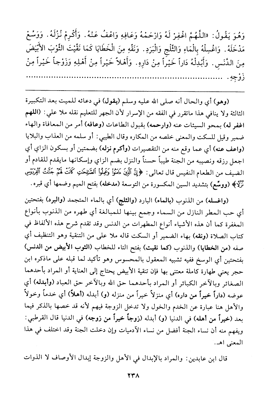 وَهُوَ يَقُولُ: "اللَّهُمَّ اغْفِرْ لَهُ وَارْحَمْهُ وَعَافِهِ وَاعْفُ عَنْهُ. وَأَكْرِمْ نُزُلَهُ. وَوَسِّعْ مَدْخَلَهُ. وَاغسِلْهُ بِالْمَاءِ وَالثَّلْجِ وَالْبَرَدِ. وَنَقِّهِ مِنَ الْخَطَايَا كَمَا نَقَّيتَ الثَّوْبَ الأَبْيَضَ مِنَ الدَّنَسِ. وَأَبْدِلْهُ دَارًا خَيرًا مِنْ دَارِهِ. وَأَهْلا خَيرًا مِنْ أَهْلِهِ وَزَوْجًا خَيرًا مِنْ زَوْجِهِ