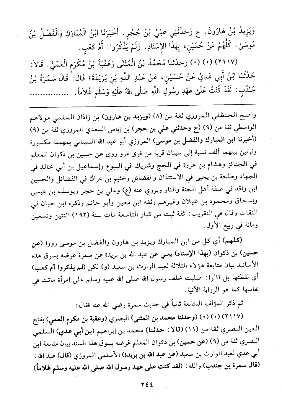 واضح الحنظلي المروزي ثقة من (٨) (ويزيد بن هارون) بن زاذان السلمي مولاهم الواسطي ثقة من (٩) (ح وحدثني علي بن حجر) بن إياس السعدي المروزي ثقة من (٩) (أخبرنا ابن المبارك والفضل بن موسى) المروزي أبو عبد الله السيناني بمهملة مكسورة ونونين بينهما ألف نسبة إلى سينان قرية من قرى مرو روى عن حسين بن ذكوان المعلم في الجنائز وهشام بن عروة في الحج وشريك في البيوع وإسماعيل بن أبي خالد في الجهاد وطلحة بن يحيى في الاستئذان والفضائل وخثيم بن عراك في الفضائل والحسين بن واقد في صفة أهل الجنة والنار ويروي عنه (ع) وعلي بن حجر ويوسف بن عيسى وإسحاق ومحمود بن غيلان وغيرهم وثقه ابن معين وأبو حاتم وذكره ابن حبان في الثقات وقال في التقريب: ثقة ثبت من كبار التاسعة مات سنة (١٩٢) اثنتين وتسعين ومائة في ربيع الأول.