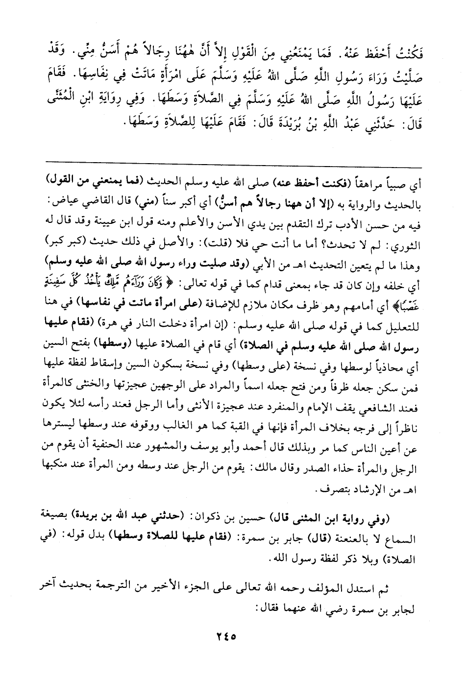 فَكُنْتُ أَحْفَظ عَنْهُ. فَمَا يَمْنَعُنِي مِنَ الْقَوْلِ إلا أَن ههُنَا رِجَالًا هُمْ أَسَنُّ مِنِّي. وَقَدْ صَلَّيتُ وَرَاءَ رَسُولِ اللهِ - صلى الله عليه وسلم - عَلَى امْرَأَةٍ مَاتَتْ في نِفَاسِهَا. فَقَامَ عَلَيهَا رَسُولُ اللهِ - صلى الله عليه وسلم - في الصَّلاةِ وَسَطَهَا. وَفِي رِوَايَةِ ابْنِ الْمُثَنَّى قَال: حَدَّثَنِي عَبْدُ اللهِ بْنُ بُرَيدَةَ قَال: فَقَامَ عَلَيهَا لِلصَّلاةِ وَسَطَهَا