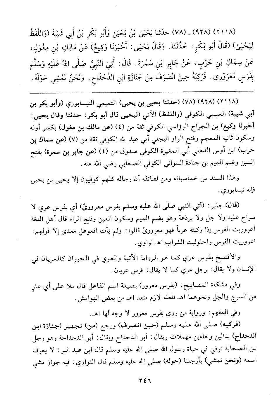 (٢١١٨) (٩٢٨) - (٧٨) حدَّثنا يَحْيَى بْنُ يَحْيَى وَأَبُو بَكْرِ بْنُ أَبِي شَيبَةَ (وَاللَّفْظُ لِيَحْيَى) (قَال أَبُو بَكْرٍ: حَدَّثَنَا. وَقَال يَحْيَى: أَخْبَرَنَا وَكِيعٌ) عَنْ مَالِكِ بْنِ مِغْوَلٍ، عَنْ سِمَاكِ بْنِ حَرْبٍ، عَنْ جَابِرِ بْنِ سَمُرَةَ. قَال: أُتِيَ النَّبِي - صلى الله عليه وسلم - بِفَرَسٍ مُعْرَوْرى. فَرَكِبَهُ حِينَ انْصَرَفَ مِنْ جَنَازَةِ ابْنِ الدَّحْدَاحِ. وَنَحْنُ نَمْشِي حَوْلَهُ