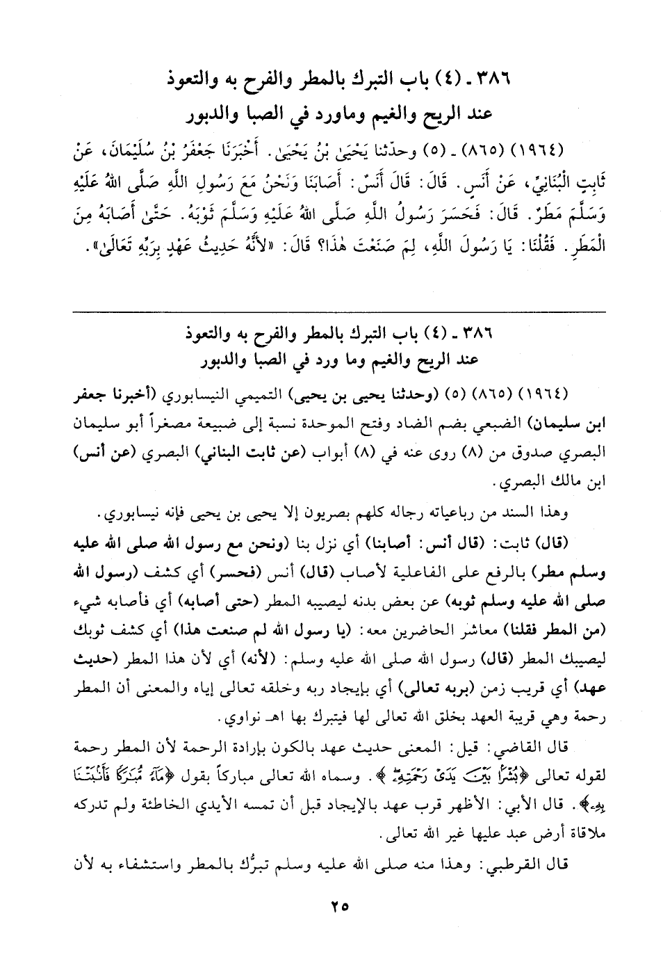(١٩٦٤) (٨٦٥) - (٥) وَحَدَّثَنَا يَحْيَى بْنُ يَحْيَى. أَخْبَرَنَا جَعْفَرُ بْنُ سُلَيمَانَ، عَنْ ثَابِتٍ الْبُنَانِيِّ، عَنْ أَنَسٍ. قَال: قَال أَنَسٌ: أَصَابَنَا وَنَحْنُ مَعَ رَسُولِ اللَّهِ صلى الله عليه وسلم مَطَرٌ. قَال فَحَسَرَ رَسُولُ اللَّهِ صلى الله عليه وسلم ثَوْبَهُ. حَتَّى أَصَابَهُ مِنَ الْمَطَرِ. فَقُلْنَا: يَا رَسُولَ اللَّهِ, لِمَ صَنَعْتَ هَذَا؟ قَال: "لأَنَّهُ حَدِيثُ عَهْدٍ بِرَبِّهِ تَعَالى"