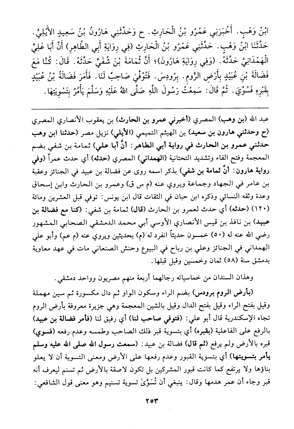 ابْنُ وَهْبٍ. أَخْبَرَنِي عَمْرُو بْنُ الْحَارِثِ. ح وَحَدَّثَنِي هَارُونُ بْنُ سَعِيدِ الأيلِيُّ. حَدَّثَنَا ابْنُ وَهْبٍ. حَدَّثَنِي عَمْرُو بْنُ الْحَارِثِ (في رِوَايَةِ أَبِي الطَاهِرِ) أن أَبَا عَلِيٍّ الْهَمْدَانِيَّ حَدَّثَهُ. (وَفِي رِوَايَةِ هَارُونَ)؛ أن ثُمَامَةَ بْنَ شُفَيٍّ حَدَّثَهُ. قَال: كُنَّا مَعَ فَضَالةَ بْنِ عُبَيدِ بِأرْضِ الرُّومِ. بِرُودِسَ. فَتُوُفِّيَ صَاحِبٌ لَنَا. فَأَمَرَ فَضَالةُ بْنُ عُبَيدٍ بِقَبْرِهِ فَسُوِّيَ. ثُمَّ قَال: سَمِعْتُ رَسُولَ اللهِ - صلى الله عليه وسلم - يَأْمُرُ بِتَسْويَتِهَا