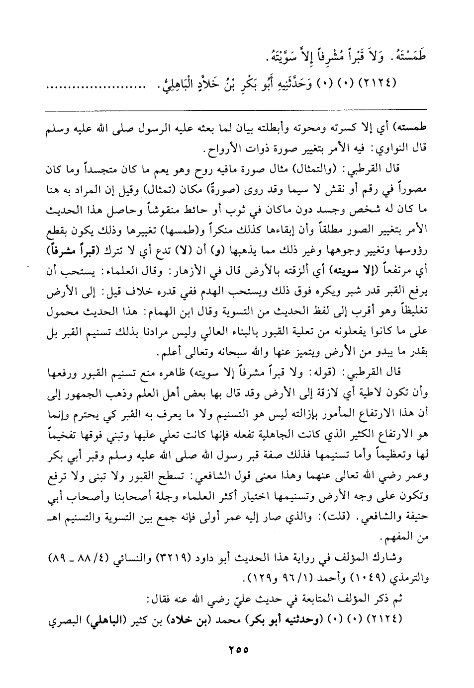 قال القرطبي: (والتمثال) مثال صورة ما فيه روح وهو يعم ما كان متجسدًا وما كان مصورًا في رقم أو نقش لا سيما وقد روى (صورةً) مكان (تمثال) وقيل إن المراد به هنا ما كان له شخص وجسد دون ما كان في ثوب أو حائط منقوشًا وحاصل هذا الحديث الأمر بتغيير الصور مطلقا وأن إبقاءها كذلك منكرًا و (طمسها) تغييرها وذلك يكون بقطع رؤوسها وتغيير وجوهها وغير ذلك مما يذهبها (و) أن (لا) تدع أي لا تترك (قبرًا مشرفًا) أي مرتفعًا (إلا سويته) أي ألزقته بالأرض قال في الأزهار: وقال العلماء: يستحب أن يرفع القبر قدر شبر ويكره فوق ذلك ويستحب الهدم ففي قدره خلاف قيل: إلى الأرض تغليظًا وهو أقرب إلى لفظ الحديث من التسوية وقال ابن الهمام: هذا الحديث محمول على ما كانوا يفعلونه من تعلية القبور بالبناء العالي وليس مرادنا بذلك تسنيم القبر بل بقدر ما يبدو من الأرض ويتميز عنها والله سبحانه وتعالى أعلم.
