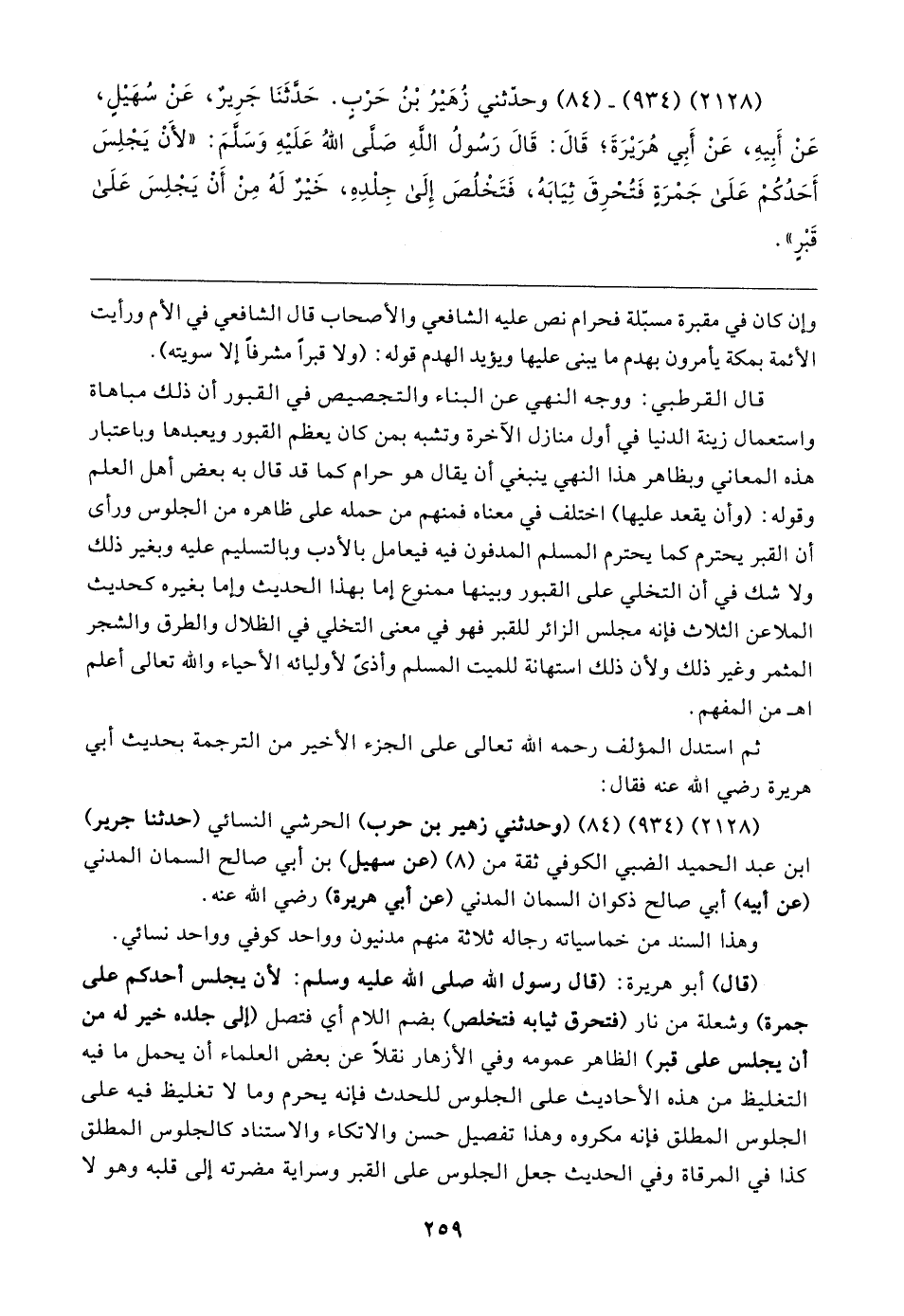 (٢١٢٨) (٩٣٤) - (٨٤) وحدّثني زُهَيرُ بْنُ حَرْبٍ. حَدَّثَنَا جَرِيرٌ، عَنْ سُهَيلٍ، عَنْ أَبِيهِ، عَنْ أَبِي هُرَيرَةَ؛ قَال: قَال رَسُول اللهِ صَلَّى اللهُ عَلَيهِ وَسَلَّمَ: "لأَنْ يَجْلِسَ أَحَدُكُمْ عَلَى جَمْرَةٍ فَتُحْرِقَ ثِيَابَهُ، فَتَخْلُصَ إِلَى جِلْدِهِ، خَيرٌ لَهُ مِنْ أَنْ يَجْلِسَ عَلَى قَبْرٍ"