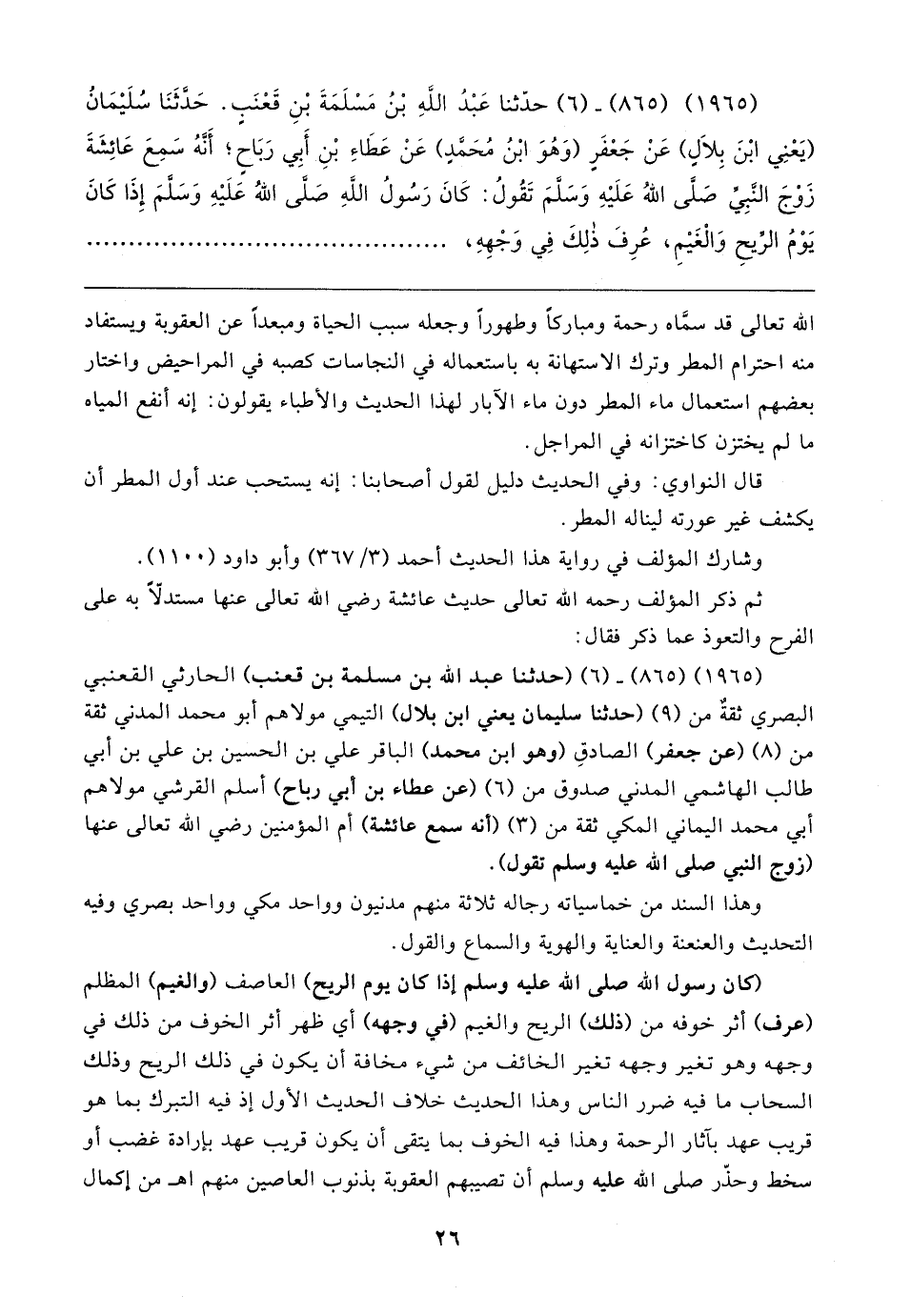 (١٩٦٥) (٨٦٥) - (٦) (حدثنا عبد الله بن مسلمة بن قعنب) الحارثي القعنبي البصري ثقةٌ من (٩) (حدثنا سليمان يعني ابن بلال) التيمي مولاهم أبو محمد المدني ثقة من (٨) (عن جعفر) الصادقِ (وهو ابن محمد) الباقر علي بن الحسين بن علي بن أبي طالب الهاشمي المدني صدوق من (٦) (عن عطاء بن أبي رباح) أسلم القرشي مولاهم أبي محمد اليماني المكي ثقة من (٣) (أنه سمع عائشة) أم المؤمنين رضي الله تعالى عنها (زوج النبي صلى الله عليه وسلم تقول).