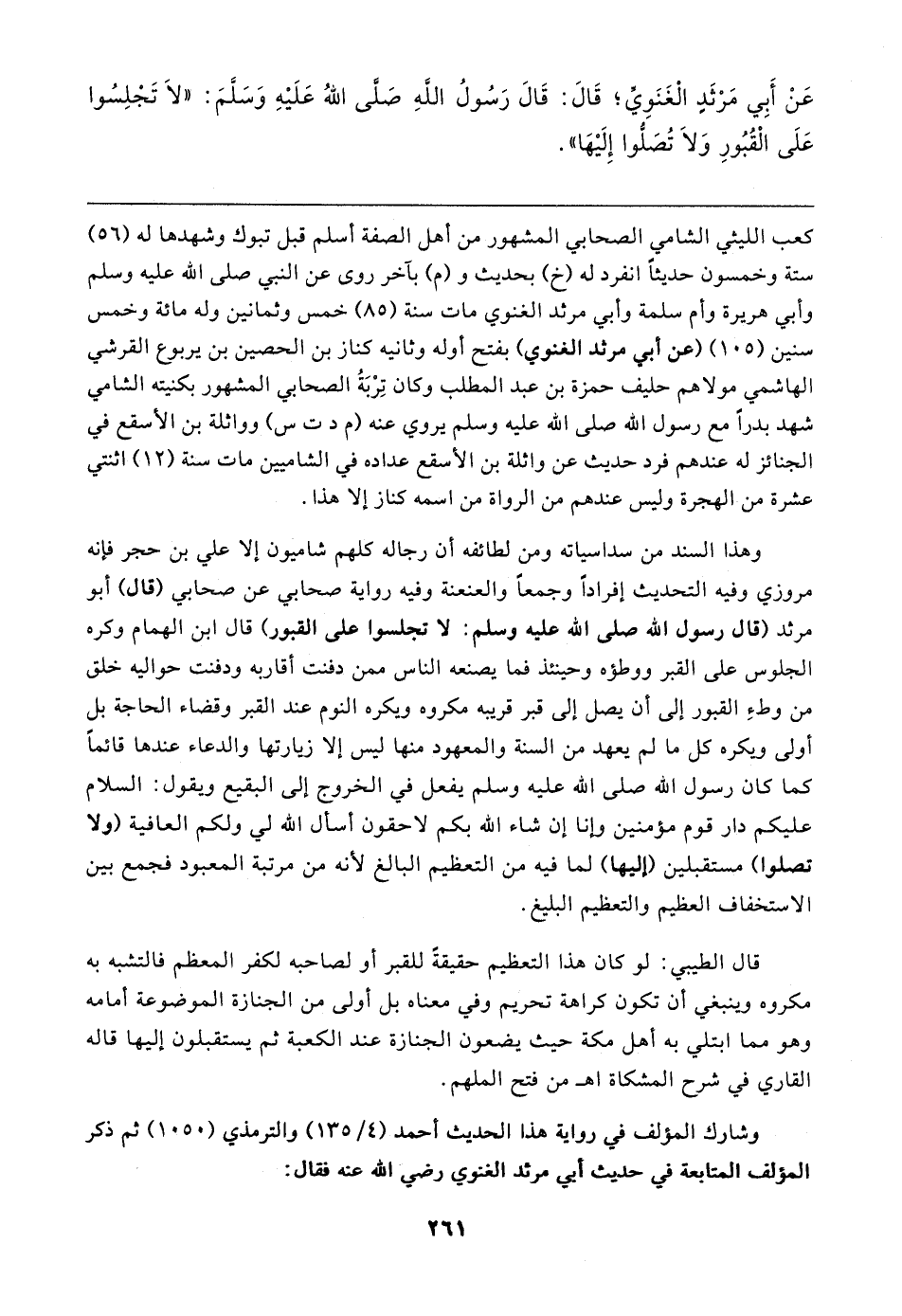 عَنْ أَبِي مَرْثَدِ الْغَنَويِّ؛ قَال: قَال رَسُولُ اللهِ صَلَّى اللهُ عَلَيهِ وَسَلَّمَ: "لَا تَجْلِسُوا عَلَى الْقُبُورِ وَلَا تُصَلُّوا إِلَيهَا"