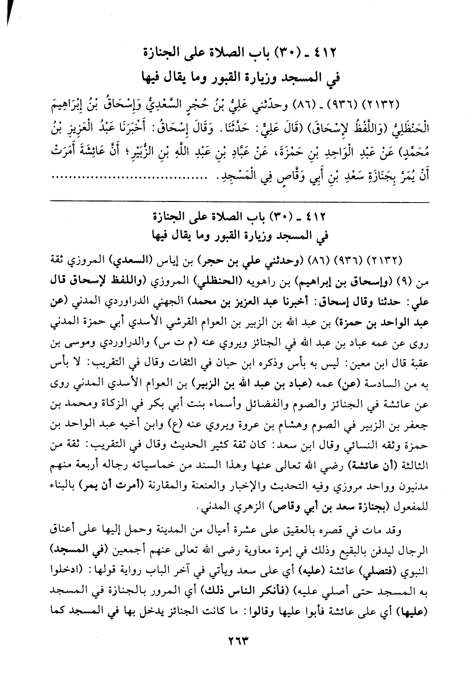 (٢١٣٢) (٩٣٦) - (٨٦) وحدّثني عَلِيُّ بْنُ حُجْرٍ السَّعْدِيُّ وَإِسْحَاقُ بْنُ إِبْرَاهِيمَ الْحَنْظَلِيُّ (وَاللَّفْظُ لإِسْحَاقَ) (قَال عَلِيٌّ: حَدَّثَنَا. وَقَال إِسْحَاقُ: أَخْبَرَنَا عَبْدُ الْعَزِيزِ بْنُ مُحَمَّدٍ) عَنْ عَبْدِ الْوَاحِدِ بْنِ حَمْزَةَ، عَنْ عَبَّادِ بْنِ عَبْدِ اللهِ بْنِ الزُّبَيرِ؛ أن عَائِشَةَ أَمَرَت أَنْ يُمَرَّ بِجَنَازَةِ سَعْدِ بْنِ أَبِي وَقَّاصٍ في الْمَسْجِدِ