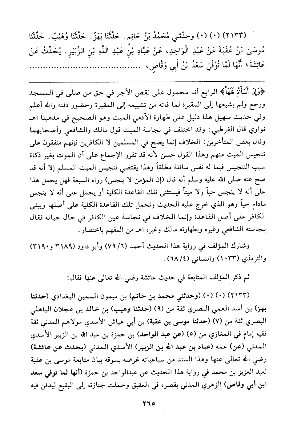 (٢١٣٣) (٠) (٠) (وحدثني محمد بن حاتم) بن ميمون السمين البغدادي (حَدَّثَنَا بهز) بن أسد العمي البصري ثقة من (٩) (حَدَّثَنَا وهيب) بن خالد بن عجلان الباهلي البصري ثقة من (٧) (حَدَّثَنَا موسى بن عقبة) بن أبي عياش الأسدي مولاهم المدني ثقة فقيه إمام في المغازي من (٥) (عن عبد الواحد) بن حمزة بن عبد الله بن الزبير الأسدي المدني (عن) عمه (عباد بن عبد الله بن الزبير) الأسدي المدني (يحدث عن عائشة) رضي الله تعالى عنها وهذا السند من سباعياته غرضه بسوقه بيان متابعة موسى بن عقبة لعبد العزيز بن محمد في رواية هذا الحديث عن عبد الواحد بن حمزة (أنها لما توفي سعد بن أبي وقاص) الزهري المدني بقصره في العقيق وحملت جنازته إلى البقيع ليدفن فيه