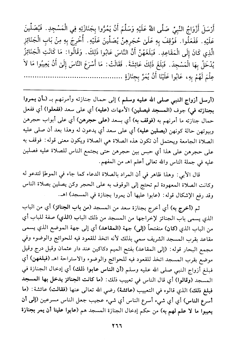 (أرسل أزواج النبي صلى الله عليه وسلم) إلى حمال جنازته وأمرنهم بـ (ـأن يمروا بجنازته في) جوف (المسجد فيصلين) الأمهات (عليه) أي على سعد (ففعلوا) أي ففعل حمال جنازته ما أمرنهم به (فوقف به) أي بسعد (على حجرهن) أي على أبواب حجرهن وبيوتهن حالة كونهن (يصلين عليه) أي على سعد أي يدعون له وهذا بعد أن صلى عليه الصلاة الجامعة ويحتمل أن تكون هذه الصلاة هي الصلاة ويكون معنى قوله: فوقف به على حجرهن على هذا أي حبس بين حجرهن حتَّى يجتمع الناس للصلاة عليه فصلين عليه في جملة الناس والله تعالى أعلم اهـ من المفهم.