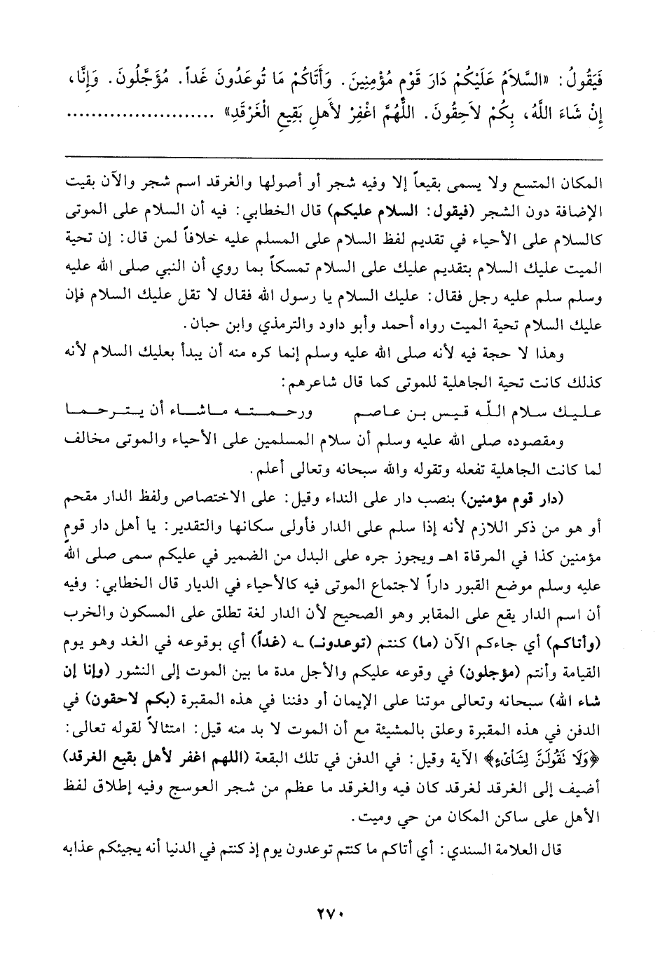 (دار قوم مؤمنين) بنصب دار على النداء وقيل: على الاختصاص ولفظ الدار مقحم أو هو من ذكر اللازم لأنه إذا سلم على الدار فأولى سكانها والتقدير: يا أهل دار قومٍ مؤمنين كذا في المرقاة اهـ ويجوز جره على البدل من الضمير في عليكم سمى صلى الله عليه وسلم موضع القبور دارًا لاجتماع الموتى فيه كالأحياء في الديار قال الخطابي: وفيه أن اسم الدار يقع على المقابر وهو الصحيح لأن الدار لغة تطلق على المسكون والخرب (وأتاكم) أي جاءكم الآن (ما) كنتم (توعدونـ) ـه (غدًا) أي بوقوعه في الغد وهو يوم القيامة وأنتم (مؤجلون) في وقوعه عليكم والأجل مدة ما بين الموت إلى النشور (وإنا إن شاء الله) سبحانه وتعالى موتنا على الإيمان أو دفننا في هذه المقبرة (بكم لاحقون) في الدفن في هذه المقبرة وعلق بالمشيئة مع أن الموت لا بد منه قيل: امتثالًا لقوله تعالى: {وَلَا تَقُولَنَّ لِشَيءٍ} الاية وقيل: في الدفن في تلك البقعة (اللهم اغفر لأهل بقيع الغرقد) أضيف إلى الغرقد لغرقد كان فيه والغرقد ما عظم من شجر العوسج وفيه إطلاق لفظ الأهل على ساكن المكان من حي وميت.