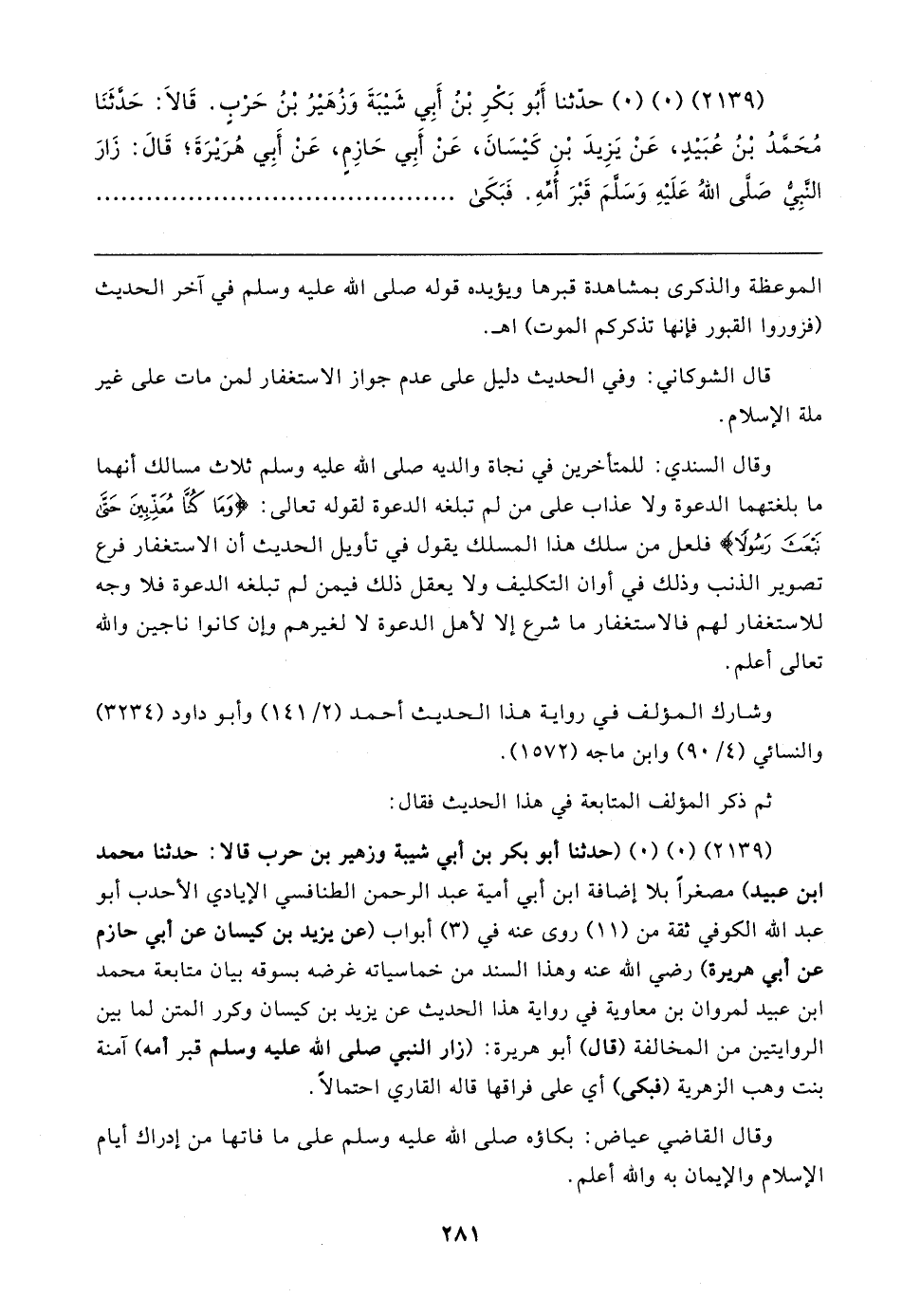 (٢١٣٩) (٠) (٠) حدَّثنا أَبُو بَكْرٍ بْنُ أَبِي شَيبَةَ وَزُهَيرُ بْنُ حَرْبٍ. قَالا: حَدَّثَنَا مُحَمَّدُ بْنُ عُبَيدٍ، عَنْ يَزِيدَ بْنِ كَيسَانَ، عَنْ أَبِي حَازِمٍ، عَنْ أَبِي هُرَيرَةَ؛ قَال: زَارَ النَّبِيُّ صَلَّى اللهُ عَلَيهِ وَسَلَّمَ قَبْرَ أُمِّهِ. فَبَكَى