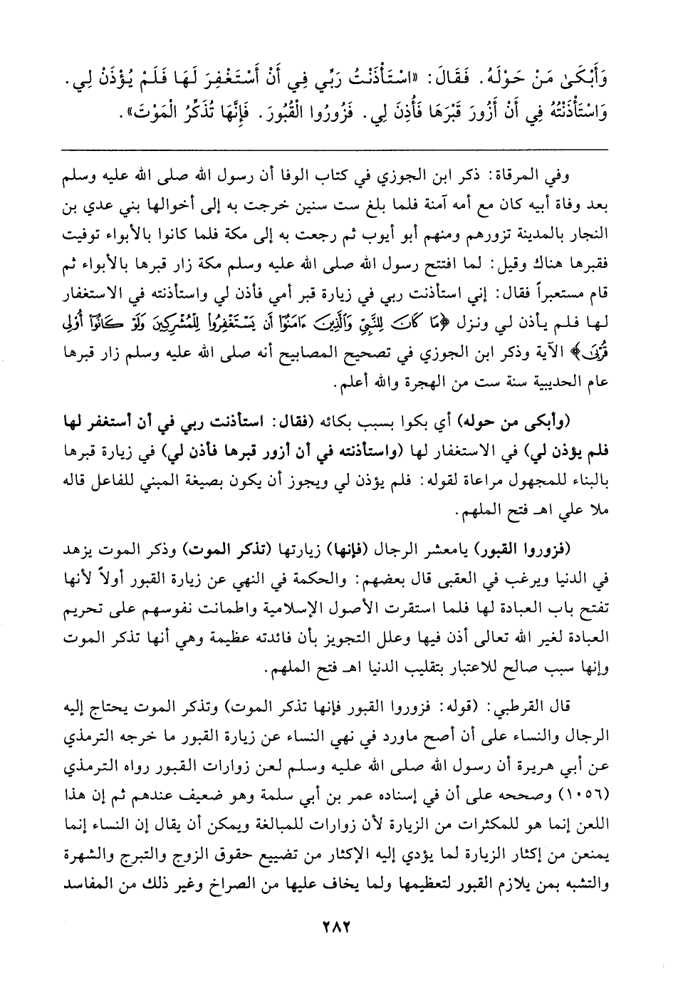 وفي المرقاة: ذكر ابن الجوزي في كتاب الوفا أن رسول الله صلى الله عليه وسلم بعد وفاة أبيه كان مع أمه آمنة فلما بلغ ست سنين خرجت به إلى أخوالها بني عدي بن النجار بالمدينة تزورهم ومنهم أبو أيوب ثم رجعت به إلى مكة فلما كانوا بالأبواء توفيت فقبرها هناك وقيل: لما افتتح رسول الله صلى الله عليه وسلم مكة زار قبرها بالأبواء ثم قام مستعبرًا فقال: إني استأذنت ربي في زيارة قبر أمي فأذن لي واستأذنته في الاستغفار لها فلم يأذن لي ونزل {مَا كَانَ لِلنَّبِيِّ وَالَّذِينَ آمَنُوا أَنْ يَسْتَغْفِرُوا لِلْمُشْرِكِينَ وَلَوْ كَانُوا أُولِي قُرْبَى} الآية وذكر ابن الجوزي في تصحيح المصابيح أنَّه صلى الله عليه وسلم زار قبرها عام الحديبية سنة ست من الهجرة والله أعلم.