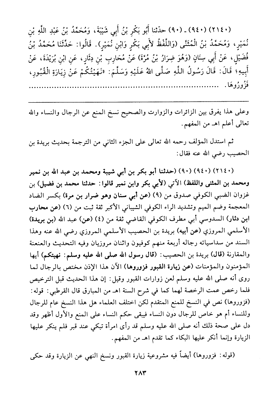 (٢١٤٠) (٩٤٠) (٩٠) (حَدَّثَنَا أبو بكر بن أبي شيبة ومحمد بن عبد الله بن نمير ومحمد بن المثنى واللفظ) الآتي الأبي بكر وابن نمير قالوا: حَدَّثَنَا محمد بن فضيل) بن غزوان الضبي الكوفي صدوق من (٩) (عن أبي سنان وهو ضرار بن مرة) بكسر الضاد المعجمة وضم الميم وتشديد الراء الكوفي الشيباني الأكبر ثقة ثبت من (٦) (عن محارب بن دثار) السدوسي أبي مطرف الكوفي القاضي ثقة من (٤) (عن) عبد الله (بن بريدة) الأسلمي المروزي (عن أبيه) بريدة بن الحصيب الأسلمي المروزي رضي الله عنه وهذا السند من سداسياته رجاله أربعة منهم كوفيون واثنان مروزيان وفيه التحديث والعنعنة والمقارنة (قال) بريدة بن الحصيب: (قال رسول الله صلى الله عليه وسلم: نهيتكم) أيها المؤمنون والمؤمنات (عن زيارة القبور فزوروها) الآن هذا الإذن مختص بالرجال لما روى أنَّه صلى الله عليه وسلم لعن زوارات القبور وقيل: إن هذا الحديث قبل الترخيص فلما رخص عمت الرخصة لهما كما في شرح السنة اهـ من المبارق قال القرطبي: قوله: (فزوروها) نص في النسخ للمنع المتقدم لكن اختلف العلماء هل هذا النسخ عام للرجال وللنساء أم هو خاص للرجال دون النساء فيبقى حكم النساء على المنع والأول أظهر وقد دل على صحة ذلك أنَّه صلى الله عليه وسلم قد رأى امرأة تبكي عند قبر فلم ينكر عليها الزيارة وإنما أنكر عليها البكاء كما تقدم اهـ من المفهم.